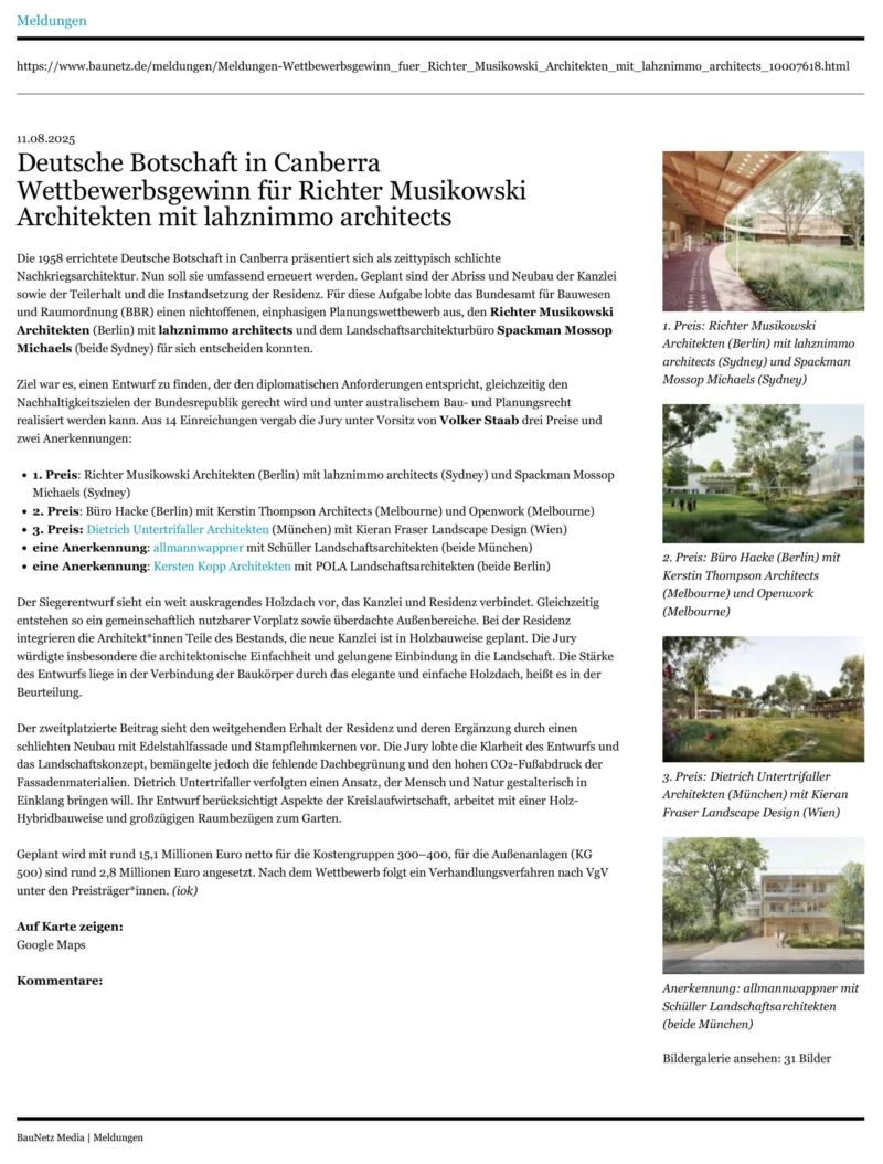Baunetz.de reports on our success in the competition for the new German Embassy building in Canberra, Australia. We entered the competition in collaboration with Lahz Nimmo Architects and Spackman Mossop Michaels.