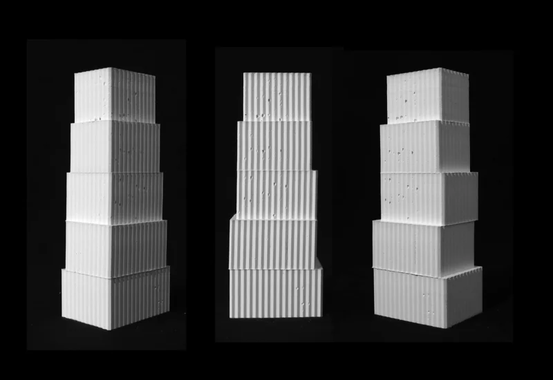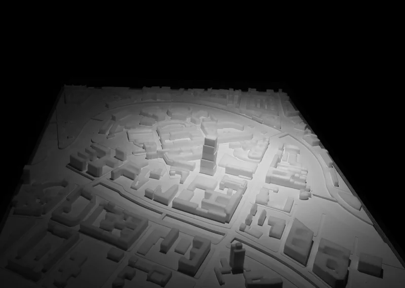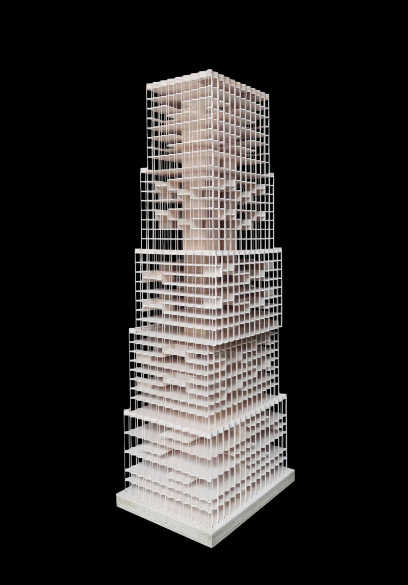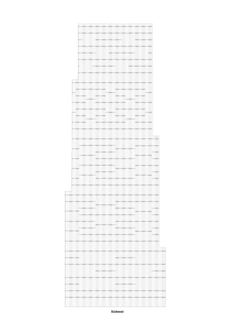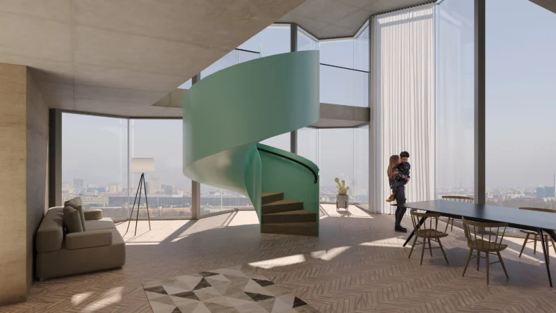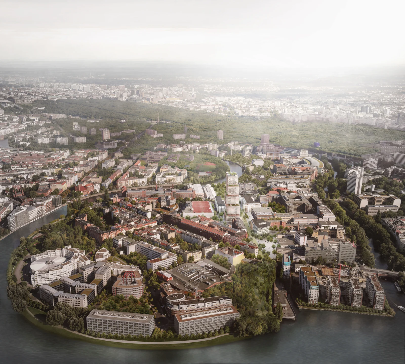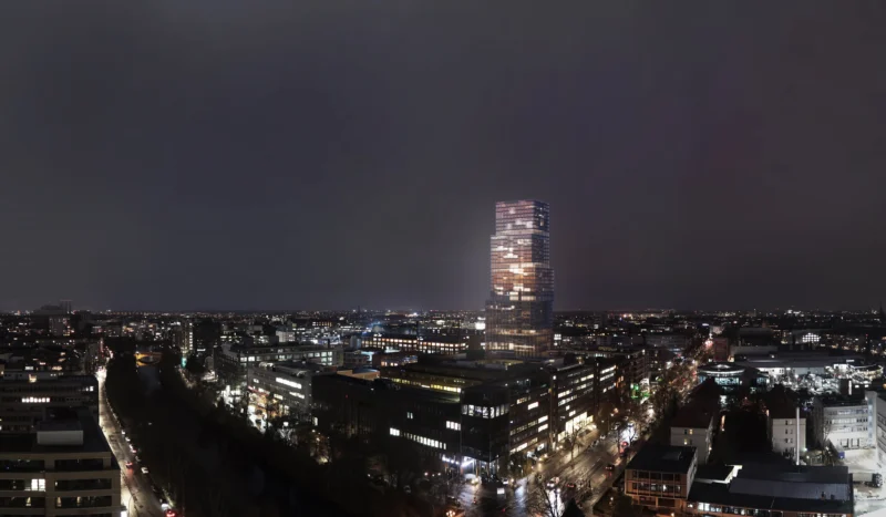 At the GSG courtyard on Helmholtzstraße in Berlin-Charlottenburg, a 40-story high-rise is being built that translates the traditional mix of uses found in Berlin’s city blocks into a vertical arrangement. The design stacks five blocks of varying sizes, each 25 meters high—based on Berlin’s standard eave height—into a stepped structure that tapers toward the top. The recesses break up the volume and create terraces for communal use.