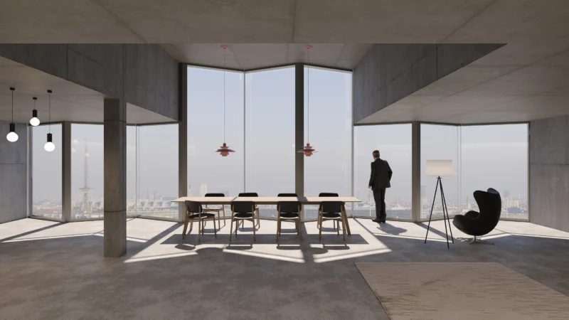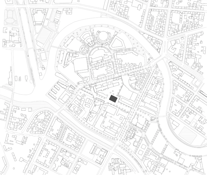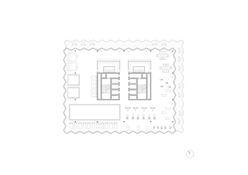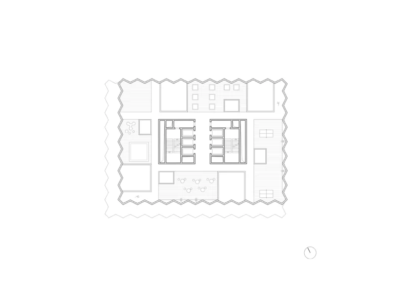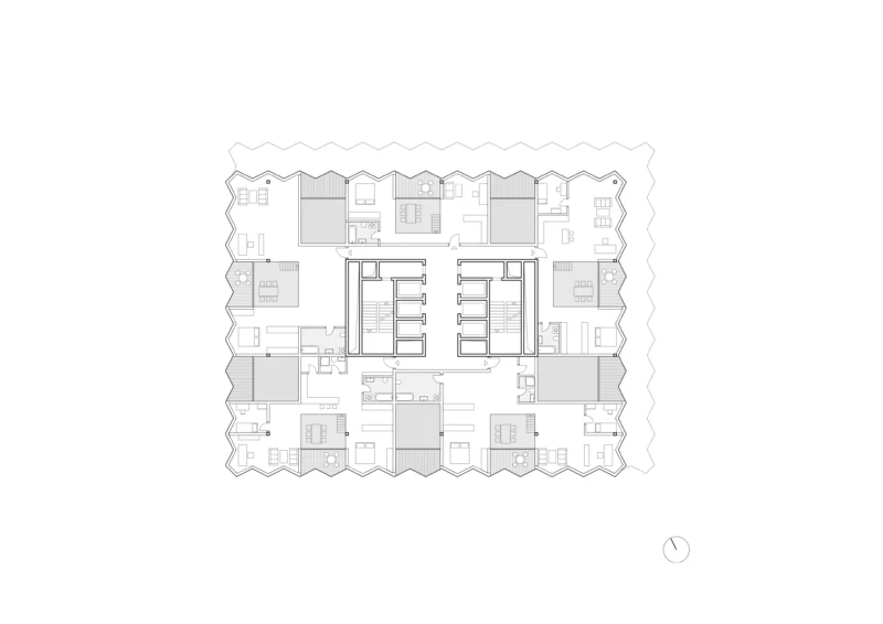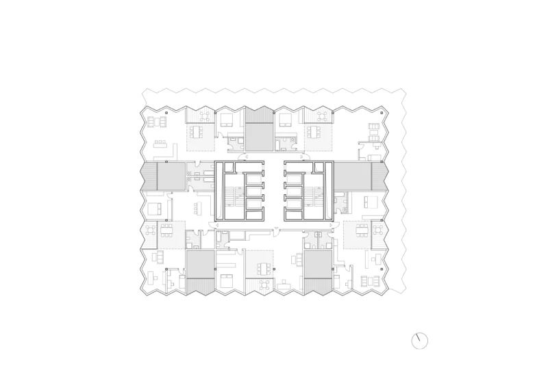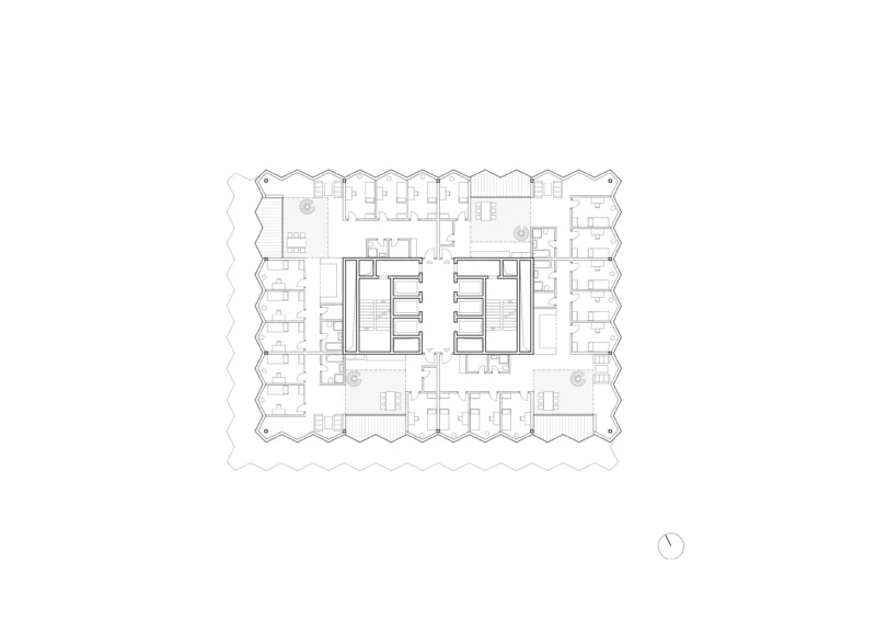 Architecturally distinctive is the folded glass façade, which reinterprets Expressionist brick architecture while combining sun protection, natural ventilation via box windows, and façade-integrated photovoltaics. A split-level system varies the ceiling heights depending on the use, creating spatial diversity instead of monotonous standard floors. In the area of the staggered ceilings, green climate balconies serve as buffer zones to the outdoor space. The energy concept relies on building component activation, geothermal energy, and a low-emission supply system for the entire neighborhood.