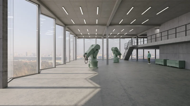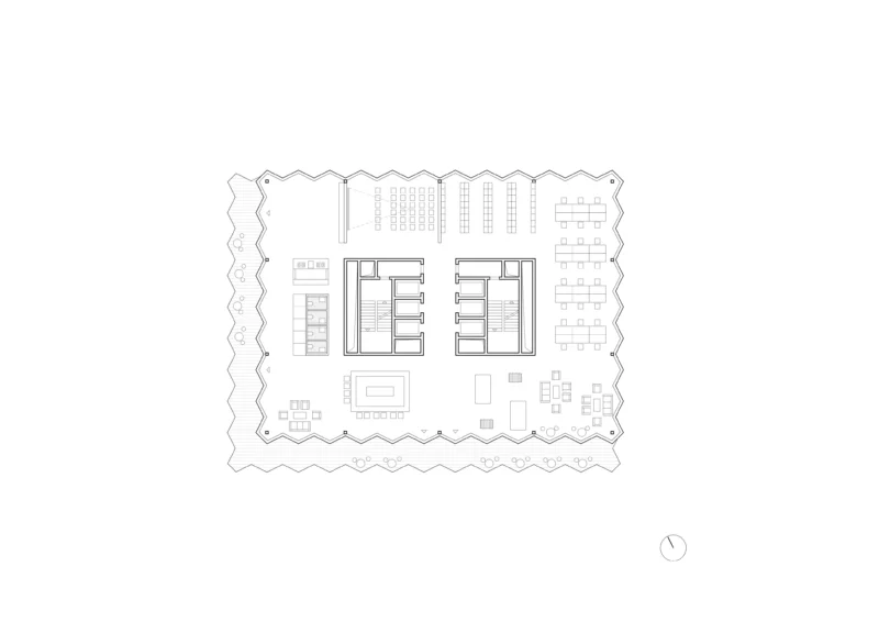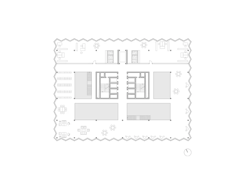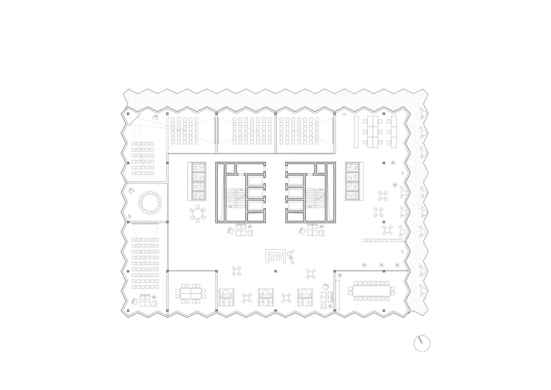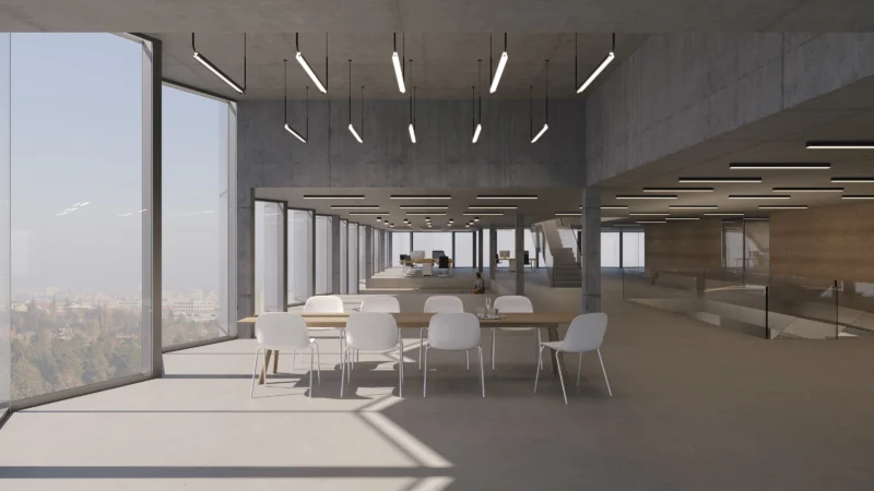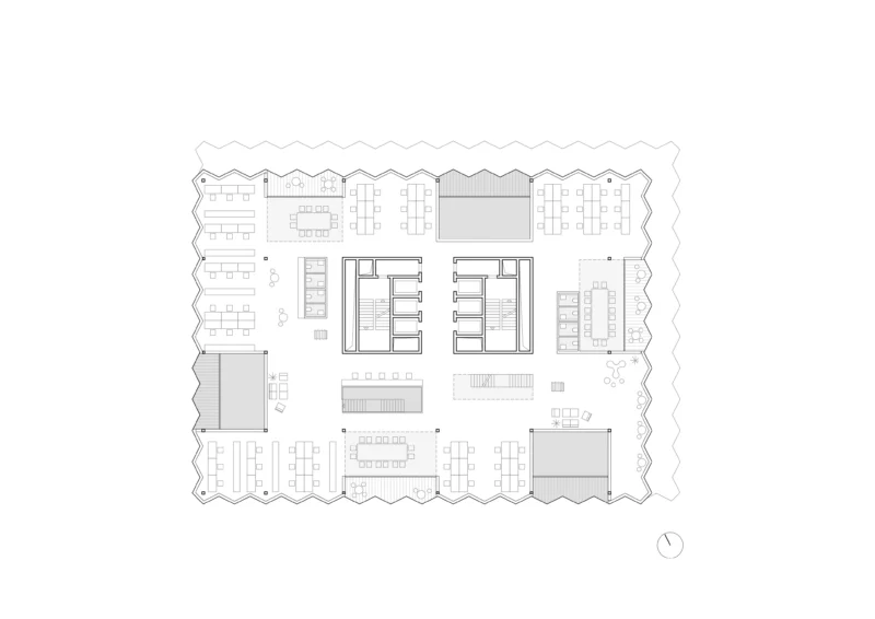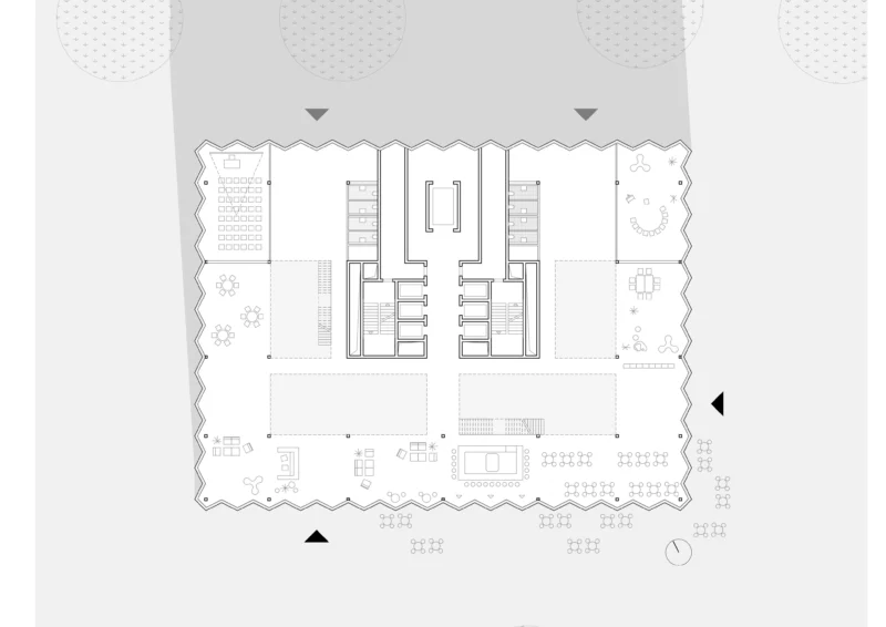 The building’s program of use is arranged from bottom to top: a public marketplace with a café and library on the ground floor, above which are manufacturing and laboratory spaces with two-story halls, followed by flexible coworking floors and traditional office spaces. The upper floors house apartments and co-living units, topped by a publicly accessible rooftop garden. In between are communal floors featuring conference spaces, a food court, fitness, and leisure areas—they connect the functional zones and encourage interaction.