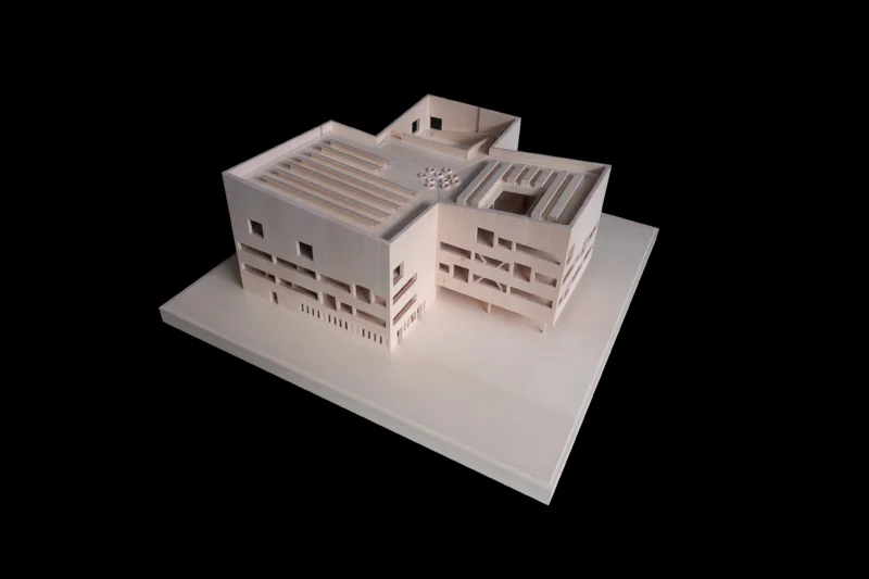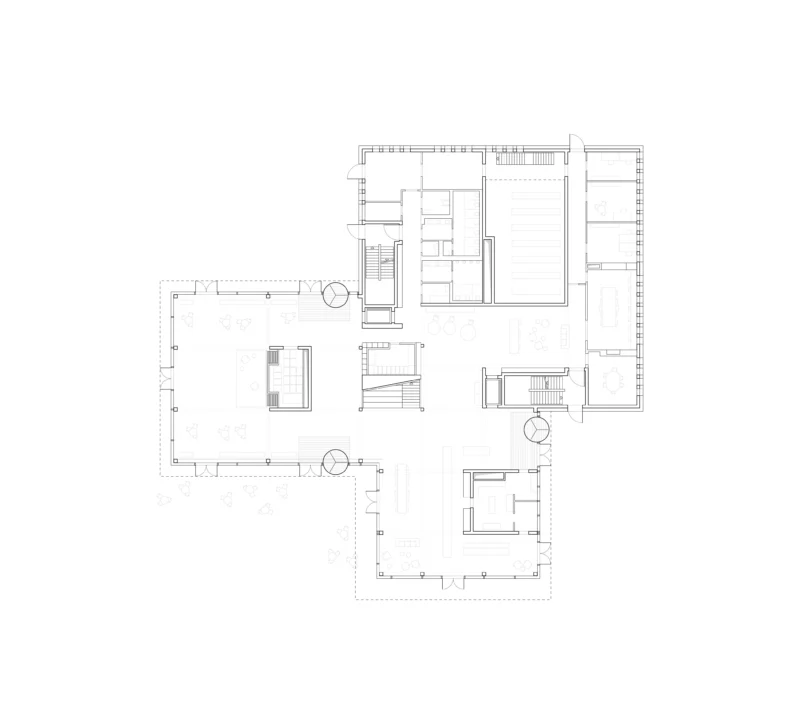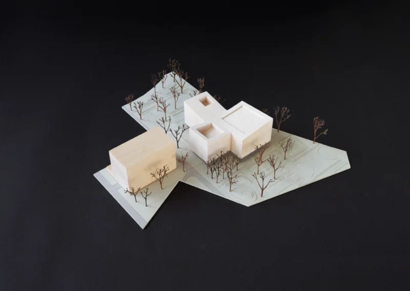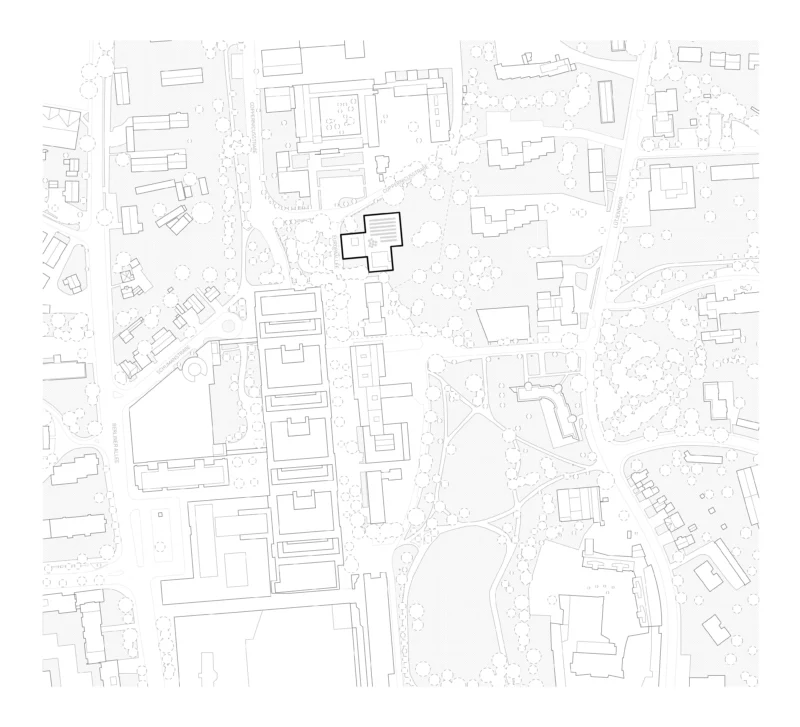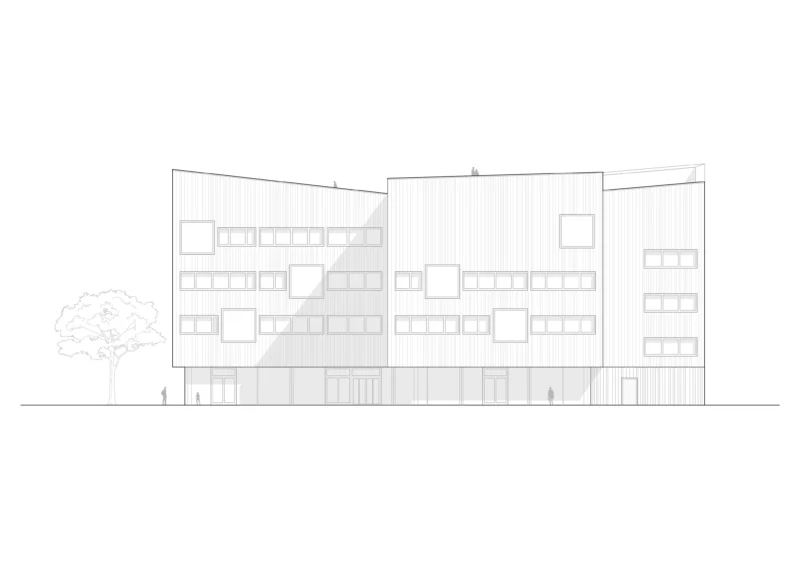 Nördlich der Europaallee entwickelt sich aus dem Zusammenspiel von Adenauerplatz und Willy-Brandt-Park eine grüne Kulturlandschaft, die im neuen Bildungshaus ihren Höhepunkt findet. Aus drei kleineren Volumen zusammengesetzt, vermittelt der Baukörper zwischen den kontrastreichen Stadtquartieren und adressiert jedes auf individuelle Art. Abgewinkelte Fassaden und überdachte Vorbereiche schaffen geschützte Aufenthaltsorte mit menschlichen Proportionen.