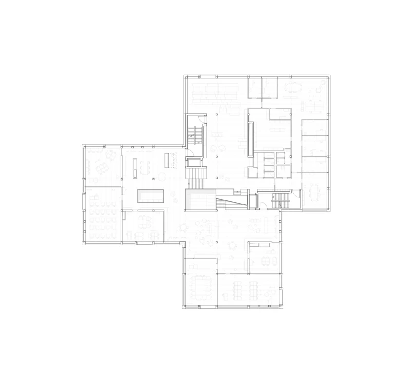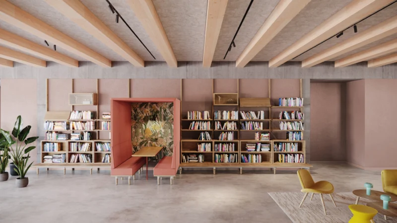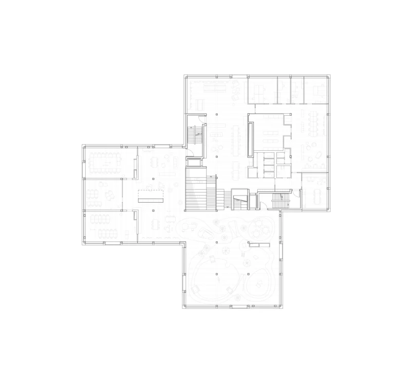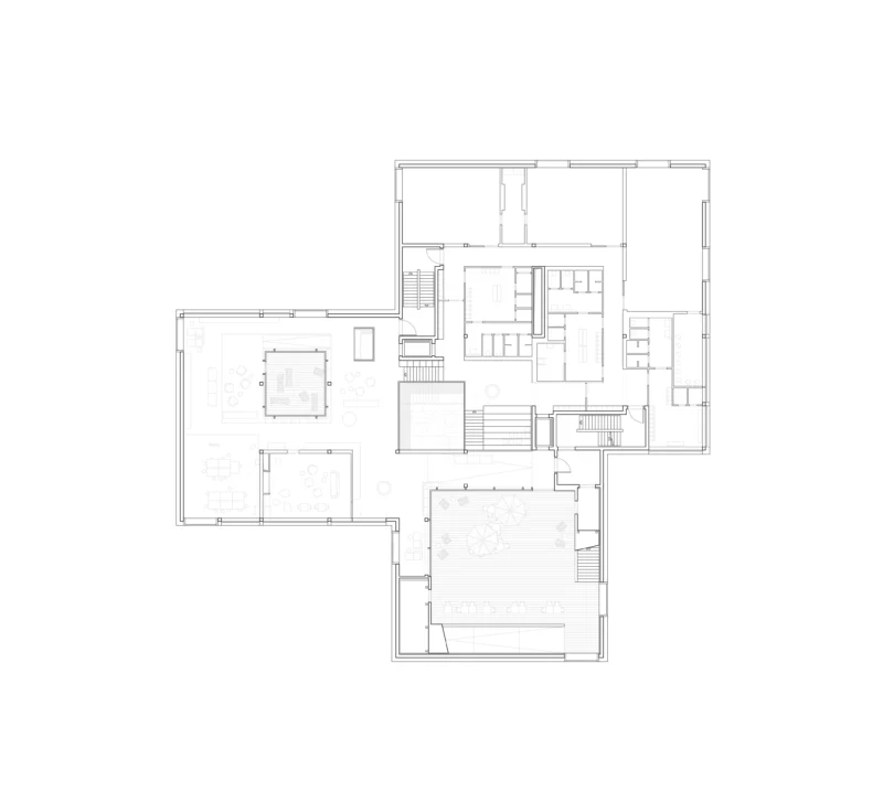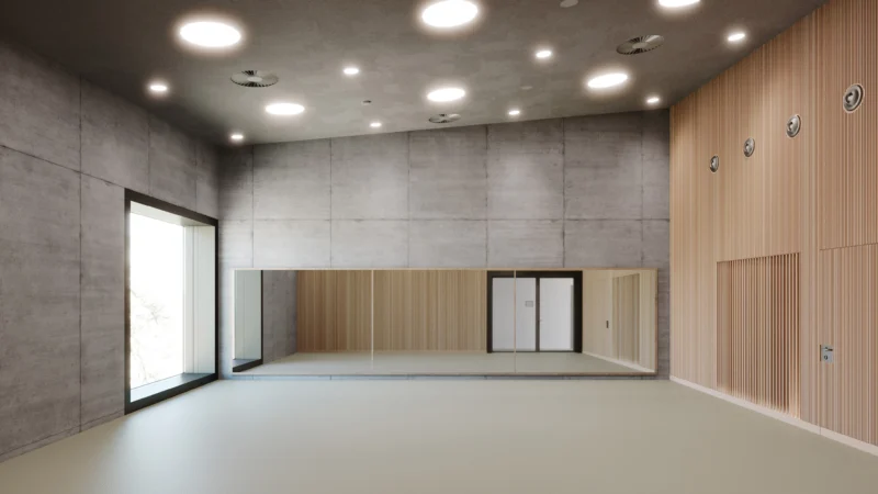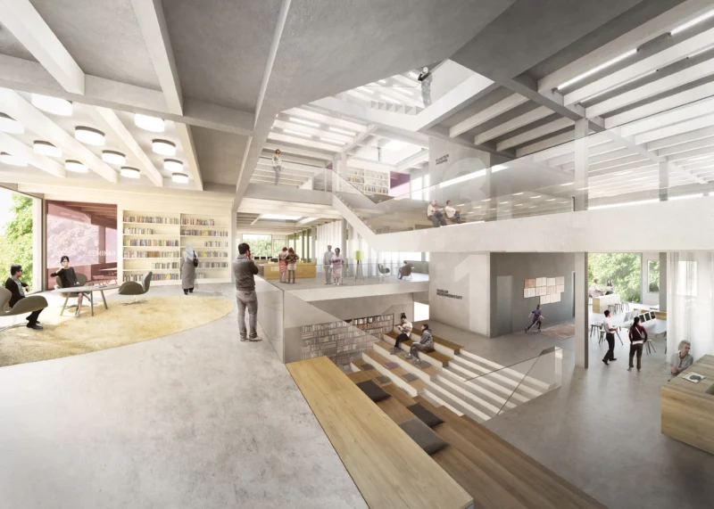 Im Inneren versteht sich das Gebäude als anregende Bildungslandschaft: Eine zentrale Bildungstreppe – ein breites, offenes Treppenensemble mit Oberlichtern und Sitzstufen – verbindet alle Etagen sichtbar miteinander und lädt zum Erkunden ein. Die Split-Level-Bauweise ermöglicht außergewöhnliche Blickbeziehungen und kurze Wege zwischen den Ebenen, die sich zu einer topografischen Lernlandschaft verbinden. Sorgsam platzierte Fenster bereichern die Innenräume mit Tageslicht und bieten großformatige Ausblicke in Park und Stadt.