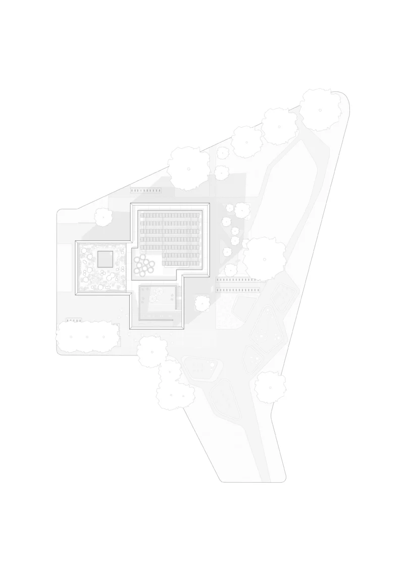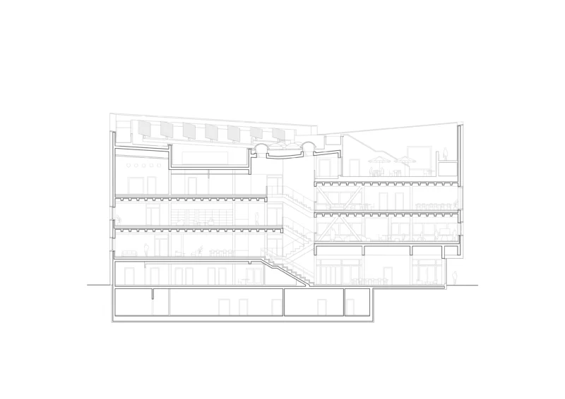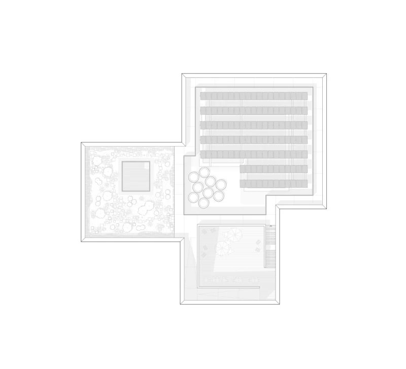 Bestehende Freiluftangebote werden auf das Dach transloziert: Wie ein Amphitheater bilden die Dachschrägen mit Treppen, Sitzflächen und Grünbereichen eine öffentliche Dachlandschaft. Das Holzhybrid-Tragsystem verkürzt durch Vorfertigung die Bauzeit, während das Atrium als Luftkamin für natürliche Belüftung und tiefe Tageslichtführung sorgt. PV-Kollektoren und Regenwassernutzung ergänzen das nachhaltige Konzept.