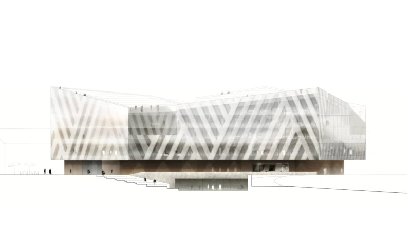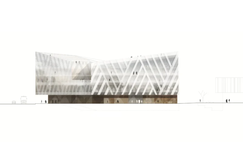 Weithin sichtbare Fassaden und großzügig überdachte Eingangszonen führen die Besucher intuitiv zum zentralen Marktplatz des Bildungshauses. Von hier aus gruppieren sich die Raumangebote zu Kommunikations-, Wissens- und Denkzonen. Balkone und ein geschützter Dachgarten bieten Freiräume für Pädagogik, Veranstaltungen und Erholung. Ein umlaufender Skywalk auf der Dachlandschaft eröffnet den Blick auf Photovoltaik-Flächen, Stadtkulisse und Bildungshorizont.
