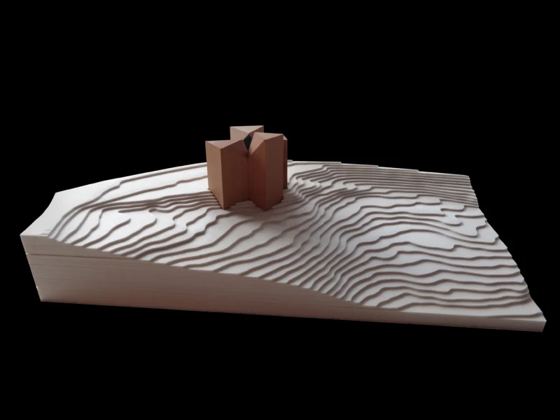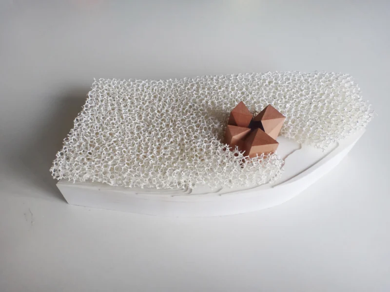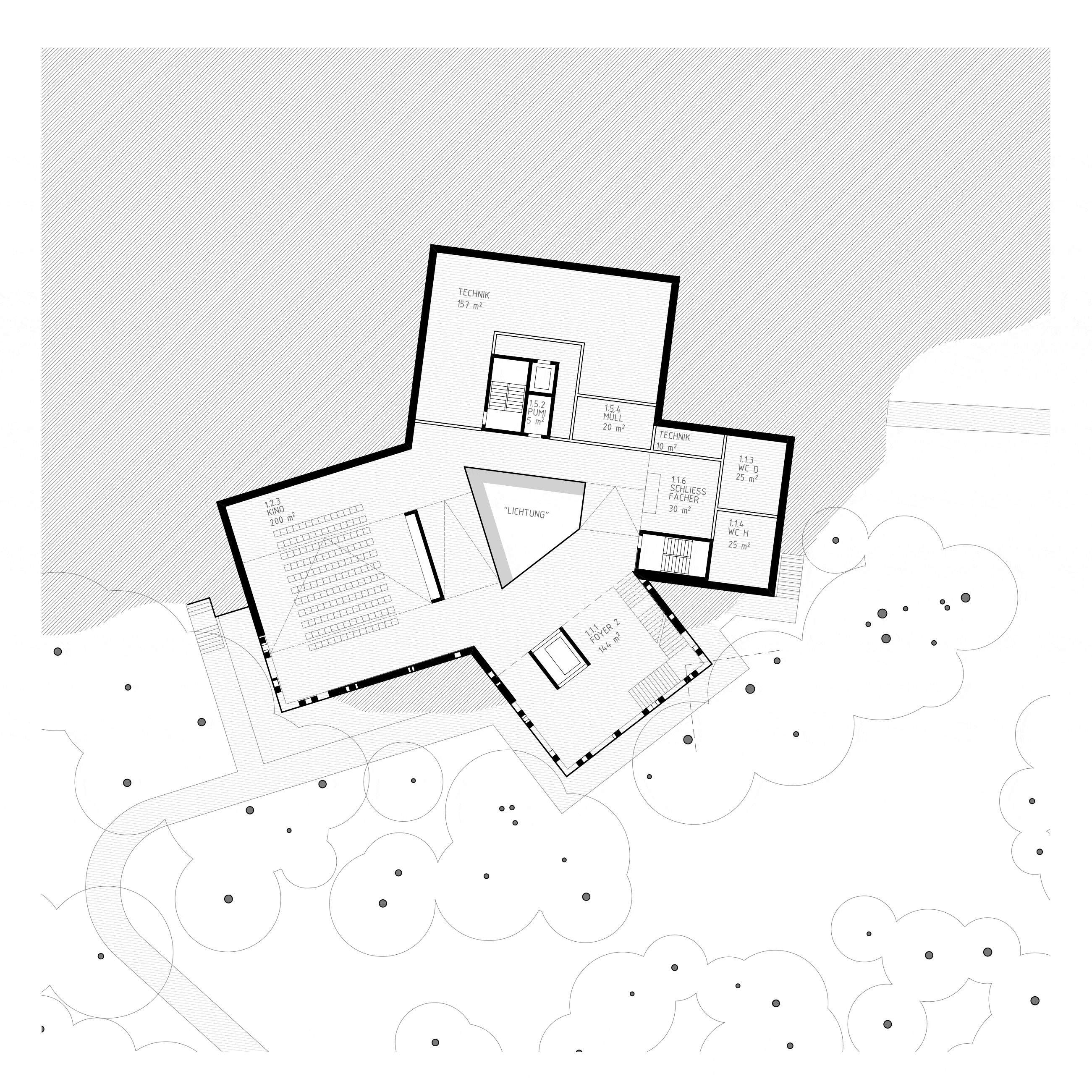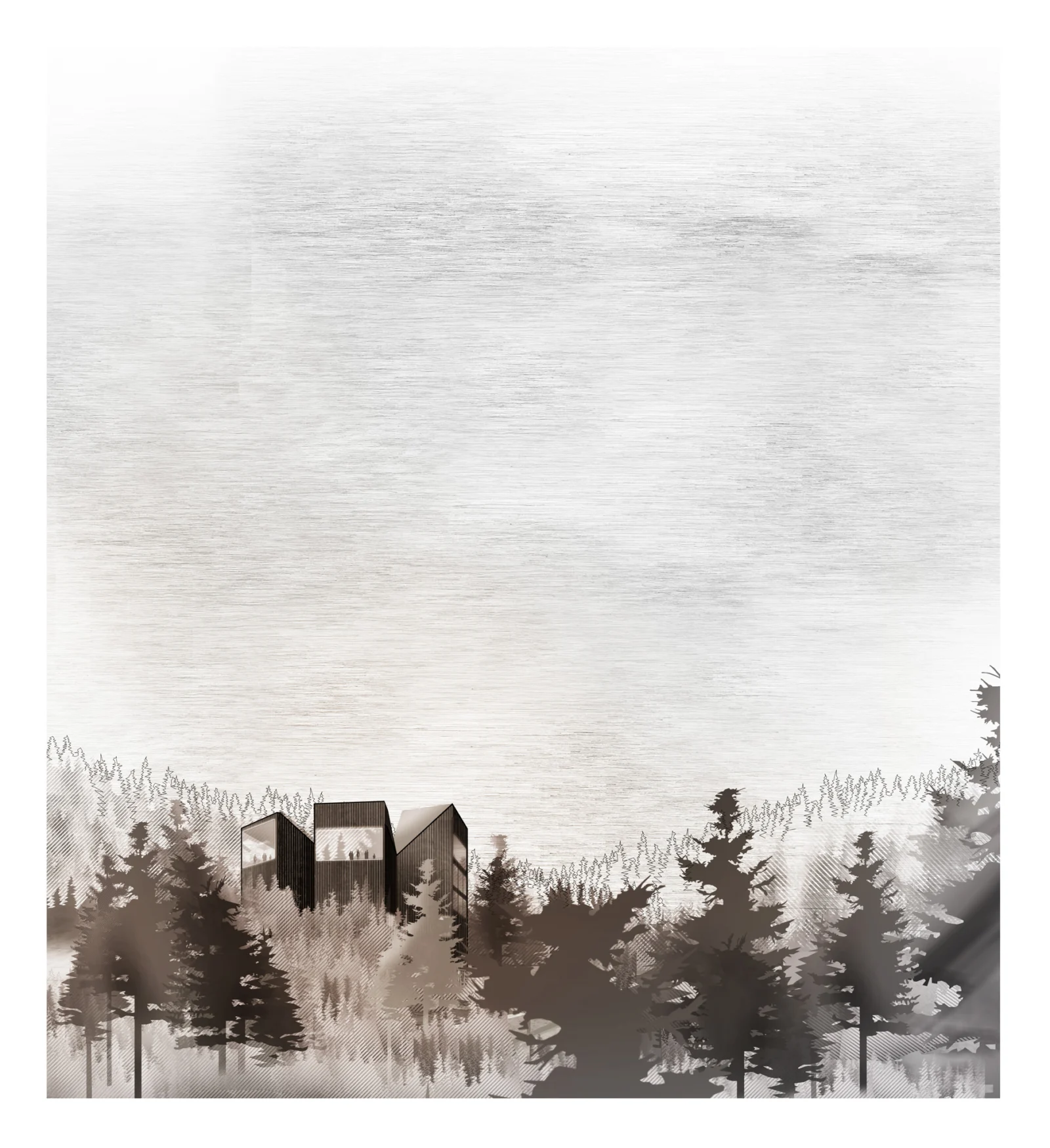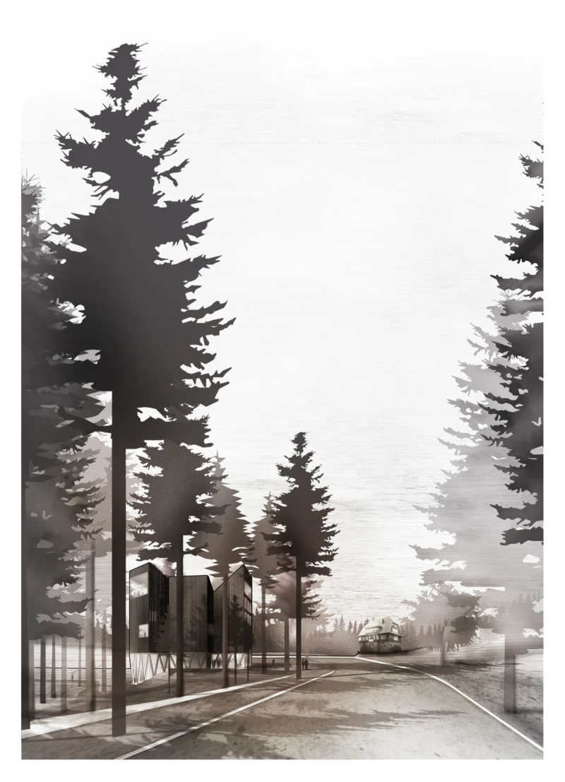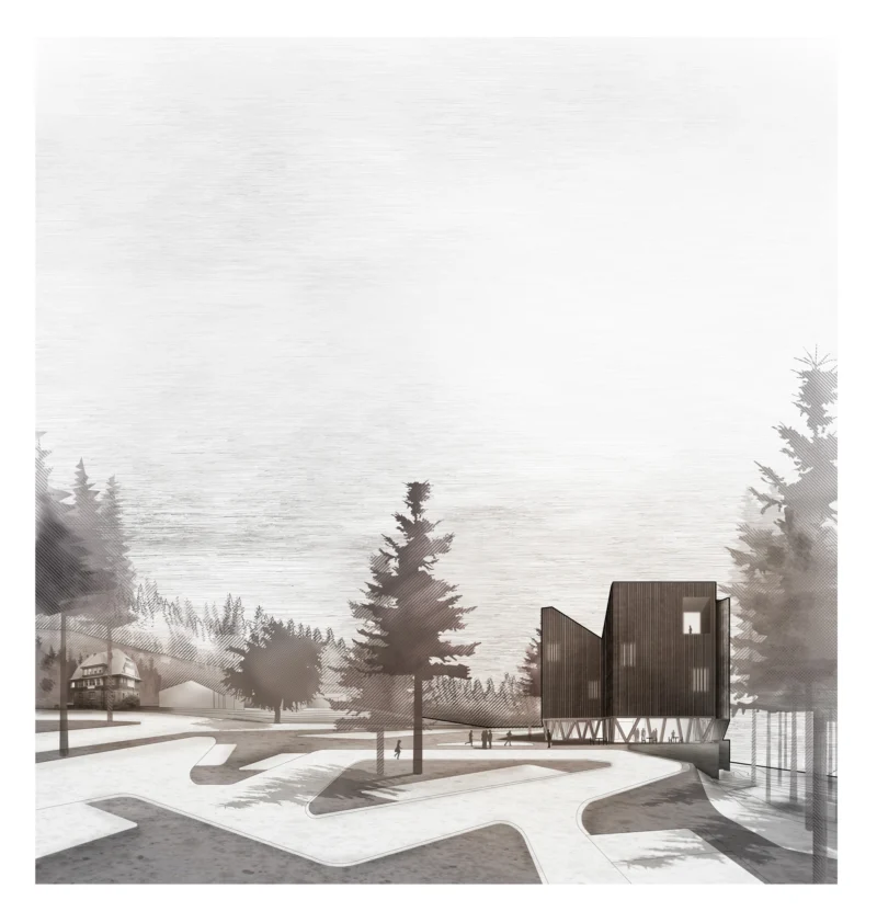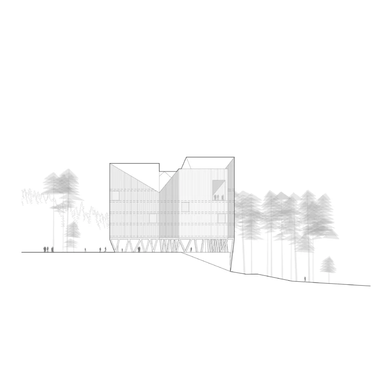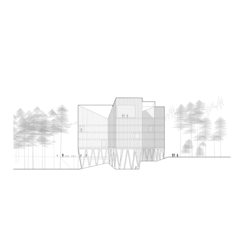 Am Ruhestein, wo die vielfältigen Aspekte des Schwarzwaldes spannungsreich zusammentreffen, wird das Besucherzentrum als Teil des Waldes diesem selbst eingepflanzt. Vier baumartig aufgeständerte Baukörper stehen an der natürlichen Hangkante und bilden miteinander eine gemeinsame Lichtung. Sie sind so hoch und so tief wie der Wald selbst – vom Blick über die Wipfel bis unter die Wurzeln wird der Wald in allen Facetten erlebbar.