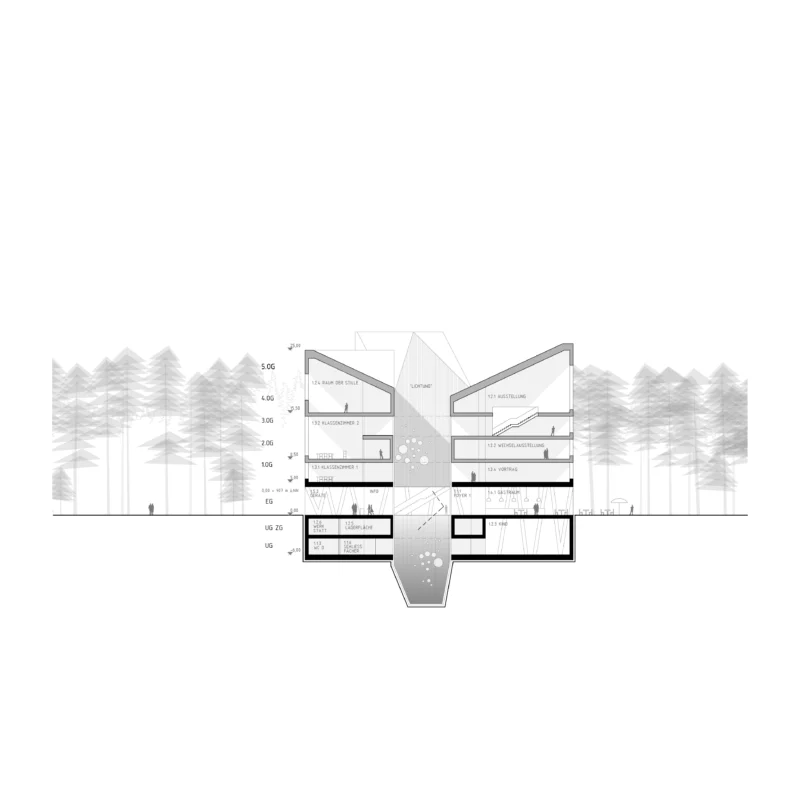Die Grundstruktur basiert auf einem Zusammenspiel aus offenen Räumen und vertikalen Erschließungswegen, die unterschiedlichste Ausstellungsszenarien und flexible Nutzungsunterteilungen ermöglichen. Ein Panoramafahrstuhl vollzieht den Nährstoffweg des Waldes und führt ins oberste Geschoss, wo ein beeindruckender Panoramablick über den Nordschwarzwald den Auftakt bildet. Von dort bewegen sich die Besucher durch die vielfältigen Ausstellungsthemen entlang der Etagen nach unten. In der Mitte des Gebäudes befindet sich eine etagenübergreifende kinetische Inszenierung des Ökosystems Wald.