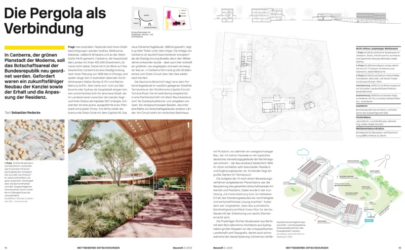 Der Artikel von Sebastian Redecke in der Bauwelt 21.2025 gibt einen guten Überblick über das Wettbewerbsergebnis zum Neubau der Deutschen Botschaft in Canberra.