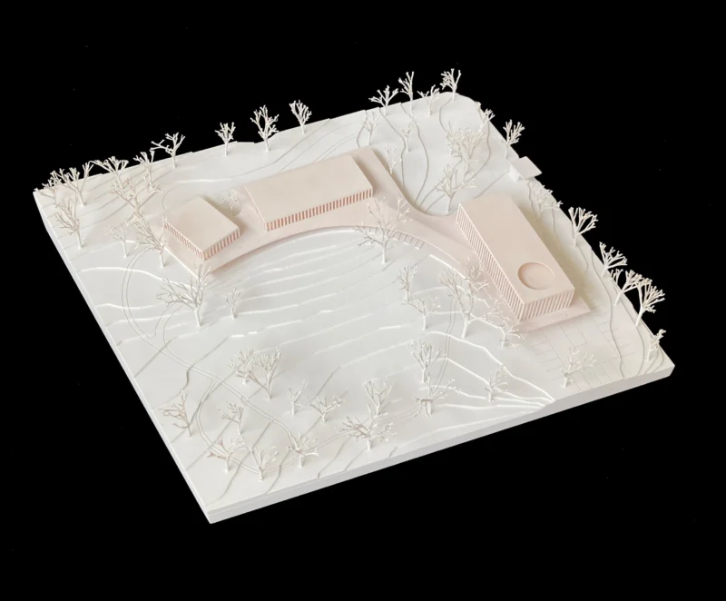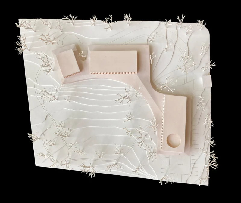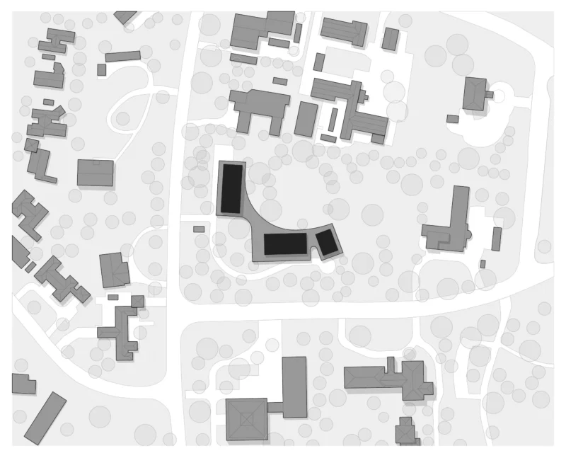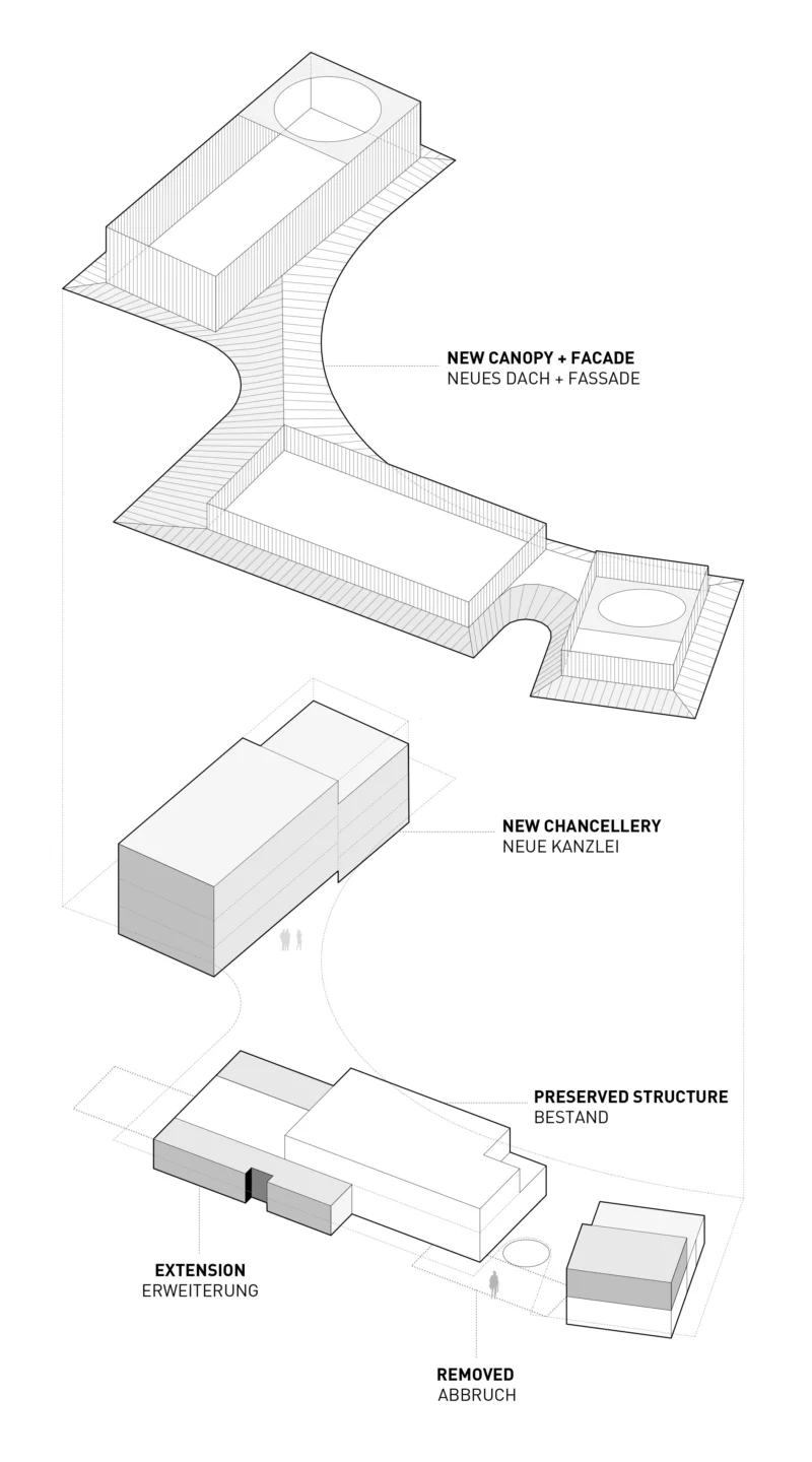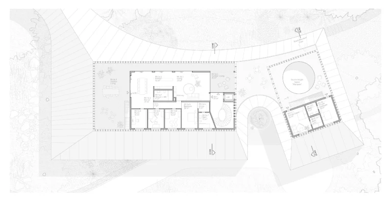 Der dreigeschossige Kanzleineubau und die zweigeschossige Residenz nehmen die Maßstäblichkeit der Umgebungsbauten auf. Die Kanzlei übersetzt den natürlichen Geländesprung in ein Split-Level-System, das kurze Sicht- und Wegeverbindungen im Inneren schafft. Die horizontal umlaufende Vordachkonstruktion mit strukturierter Untersicht und Lichtöffnungen erzeugt vielfältige Zwischenräume für informelle Besprechungen, Pausen und Rückzug.