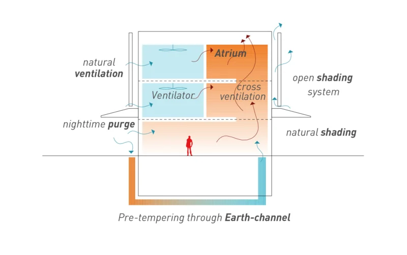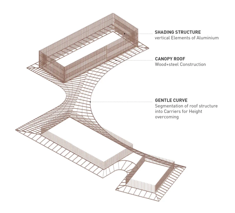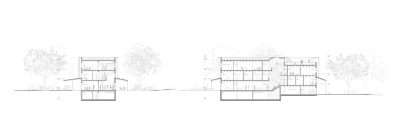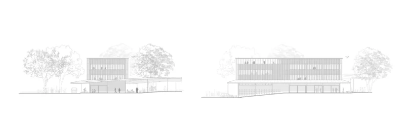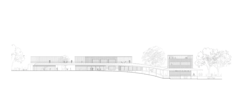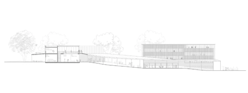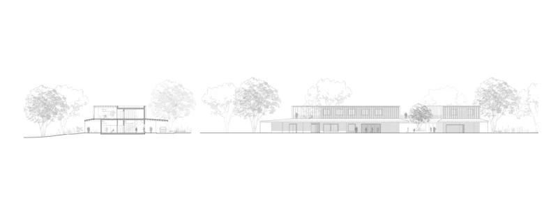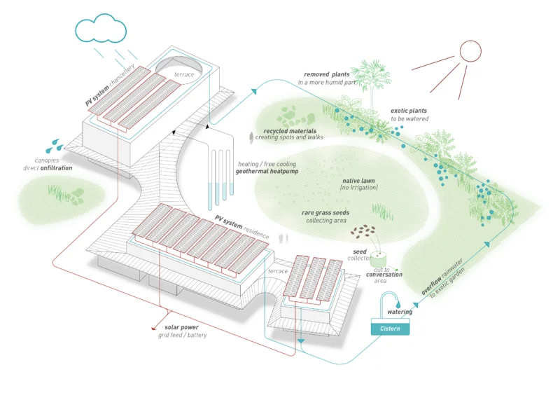 Die neue Landschaftsarchitektur folgt dem Genius Loci und nutzt Elemente des Monaro Grasslands: Eukalyptusbäume und einheimische Gräser ersetzen die bisherige energie- und wasserintensive Bepflanzung durch einen trockenheitsresistenten Garten. Der Entwurf setzt auf Mischbauweise aus Holz und Hanfkalk für die Obergeschosse, Stahlbeton für Untergeschoss und Kerne. Recyclierte Abrissmaterialien werden im Außenbereich wiederverwendet, Regenwasser vollständig auf dem Grundstück versickert.