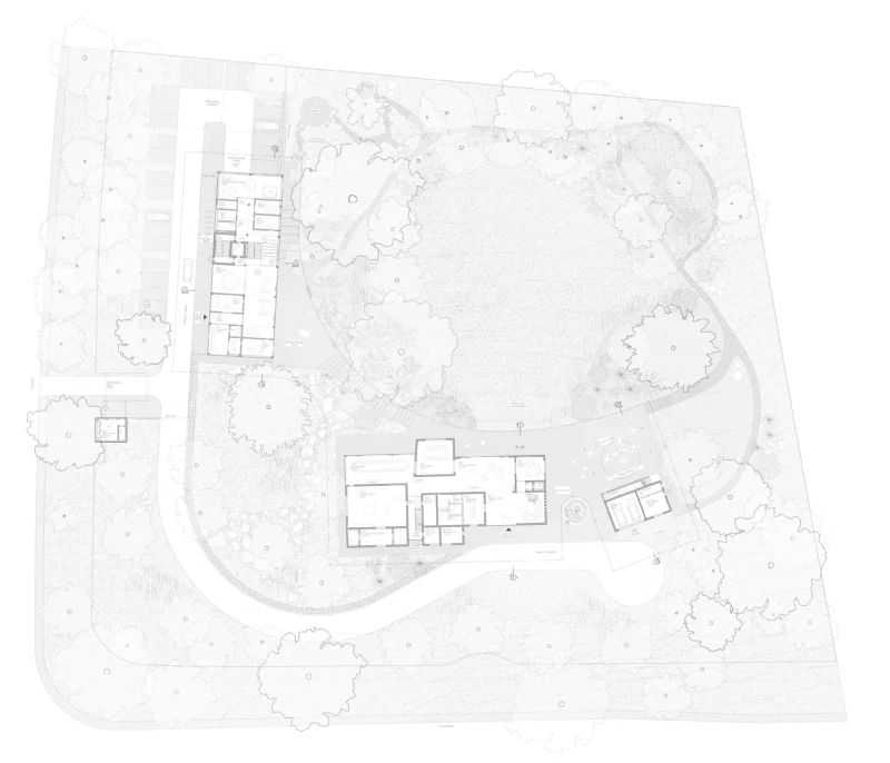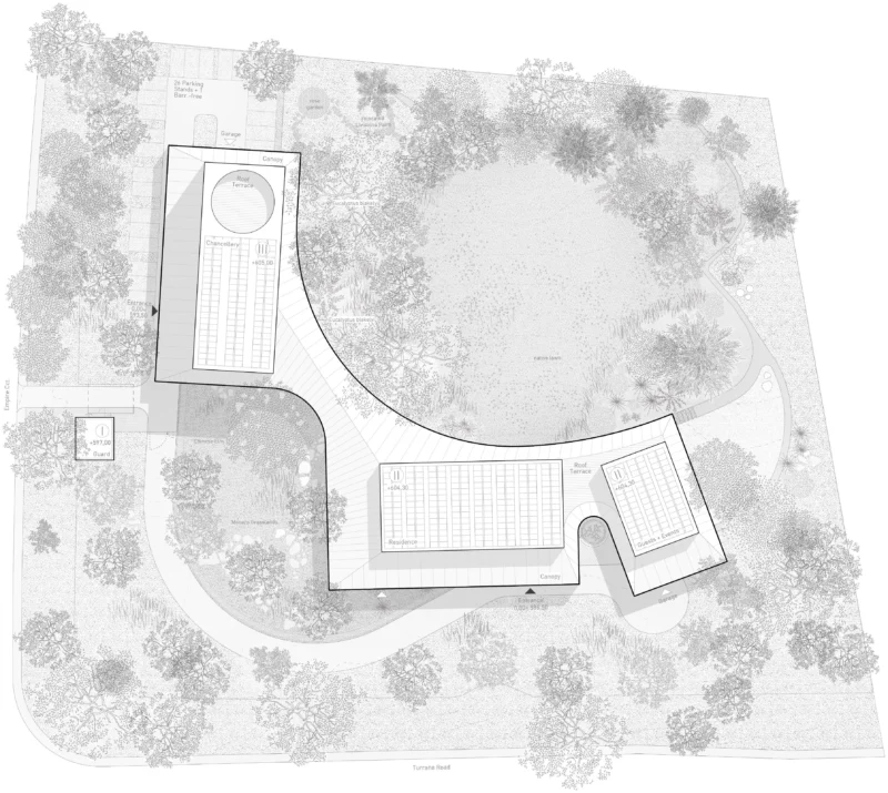 Geprägt von der Landschaft und Topografie des Geländes in Yarralumla, entwickelt der Entwurf für die Deutsche Botschaft in Canberra einen repräsentativen und zugleich intimen, poetischen Garten. Das Oval der Rasenfläche und die umgebenden Baumkronen beschreiben auf natürliche Weise einen sanft abfallenden, raumbildenden Bogen. Ein neues Pergoladach ergänzt diesen entstehenden Raum und verbindet sowohl die Gebäude als auch den Naturraum miteinander – eine Metapher für die Beziehung zwischen Deutschland und Australien.