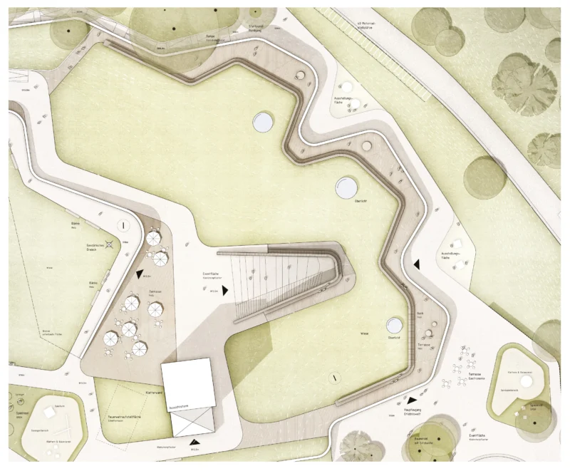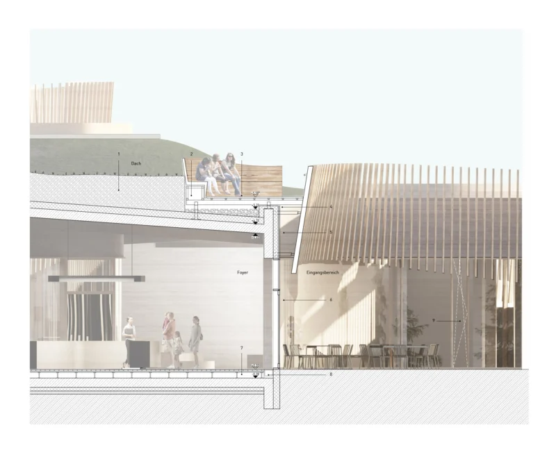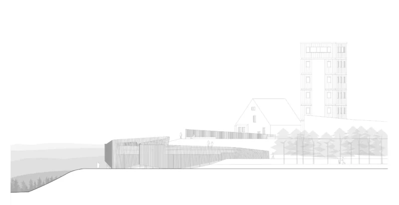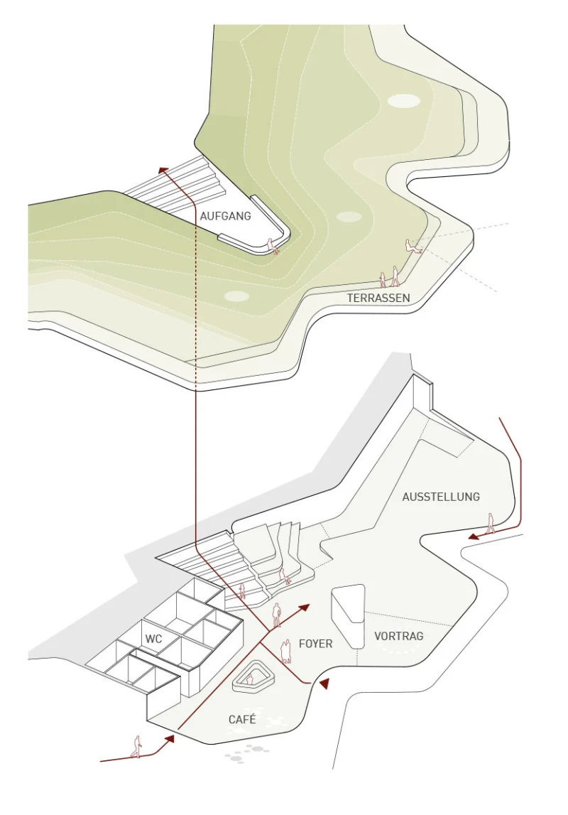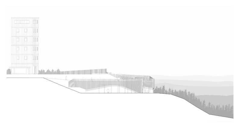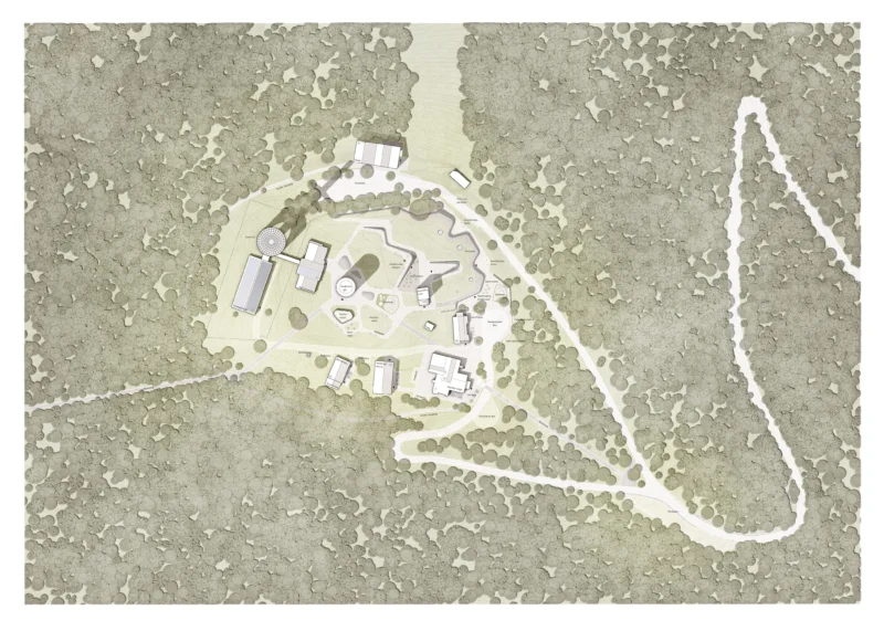 Das Plateau wird wieder für alle barrierefrei erschlossen. Der Rennsteig führt gemäß seinem historischen Verlauf direkt über den Gipfel, ein umlaufender Rundweg umfasst die Anlagen unterhalb des Plateaus. Die zusätzlichen Bau-Volumen für Hotel, Herberge und weitere Übernachtungsmöglichkeiten werden unterhalb des Plateaus verortet, eingefasst von Baumbestand und Neuaufforstung. So bleibt die Silhouette des Berges gewahrt, während der Berggasthof Stöhr und die Herberge mit ihrer baulichen Geschichte weiterhin die Identität des Ortes prägen.