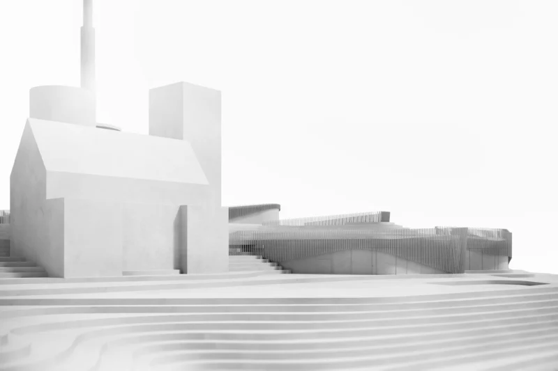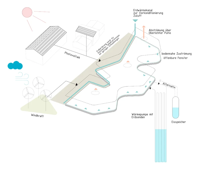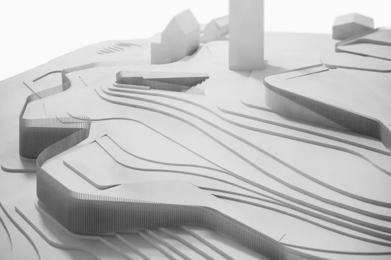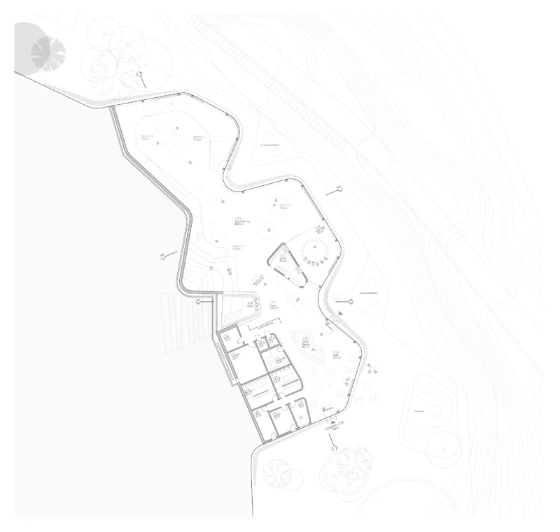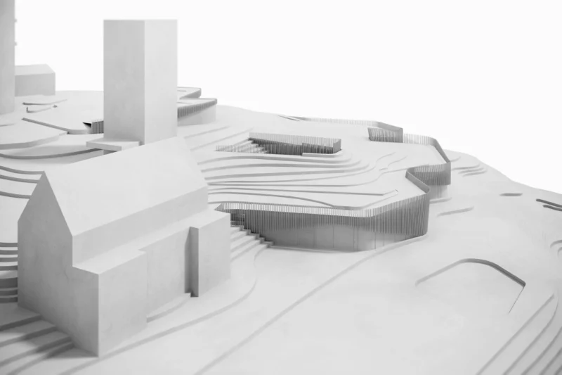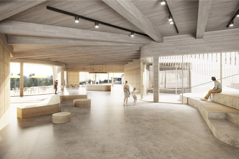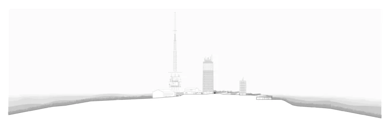 Das Plateau wird wieder für alle barrierefrei erschlossen. Der Rennsteig führt gemäß seinem historischen Verlauf direkt über den Gipfel, ein umlaufender Rundweg umfasst die Anlagen unterhalb des Plateaus. Die zusätzlichen Bau-Volumen für Hotel, Herberge und weitere Übernachtungsmöglichkeiten werden unterhalb des Plateaus verortet, eingefasst von Baumbestand und Neuaufforstung. So bleibt die Silhouette des Berges gewahrt, während der Berggasthof Stöhr und die Herberge mit ihrer baulichen Geschichte weiterhin die Identität des Ortes prägen.