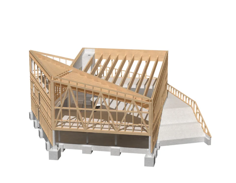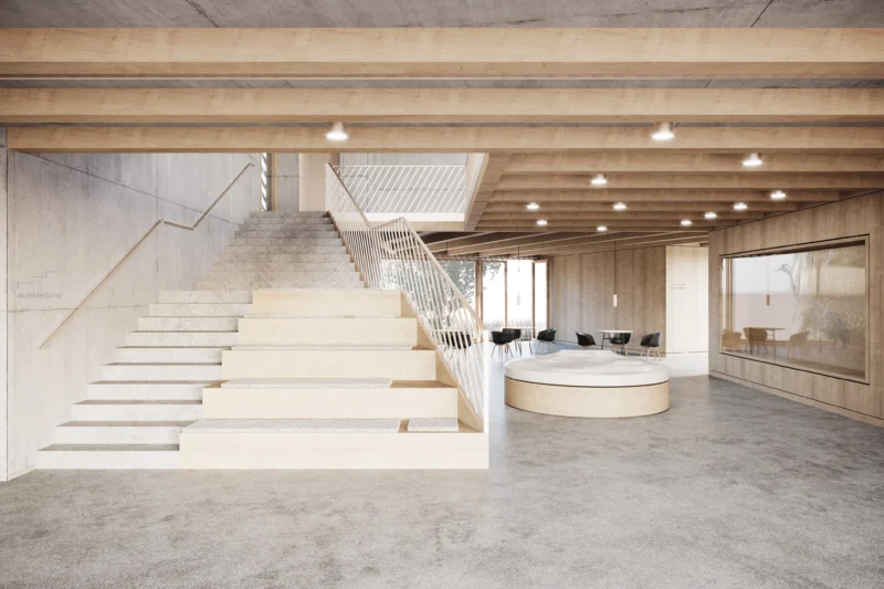 Das Haupttragwerk besteht aus einem Skelettbau in Holzbauweise. Das gestaltprägende Faltdach aus Brettschichtholzträgern orientiert sich an der statischen Notwendigkeit, während die Wandbauteile als traditionelle Holzrahmenkonstruktionen die Verbindung zur Region herstellen. Im Außenraum erinnern spielerisch verteilte Steine, Gräser und Wildstauden an die Naturelemente entlang des Kranichzugs – von skandinavischen Graniten bis zu Gräsern der iberischen Halbinsel. Eine reversible Wärmepumpe mit Erdwärmesonden, Photovoltaik und natürliche Lüftung über Oberlichter sichern einen nachhaltigen Betrieb.