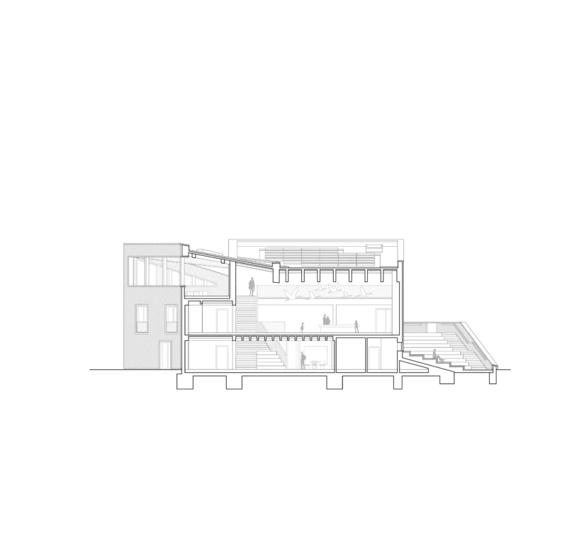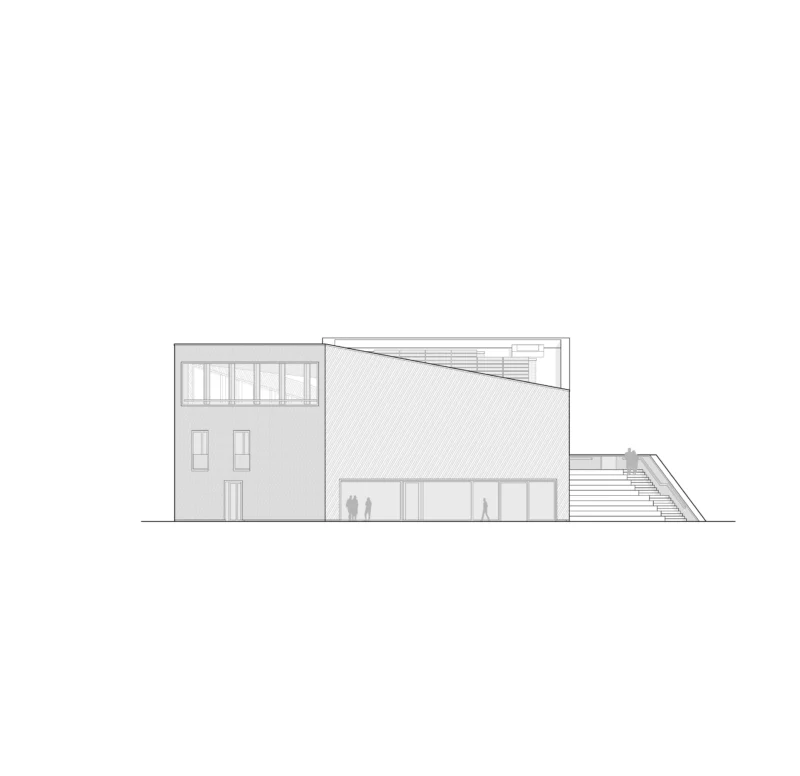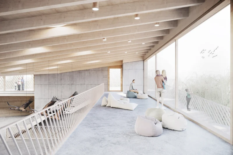 Die Sprache des Baus lässt viele Assoziationen mit der Natur- und Vogelwelt zu, ohne sie direkt zu imitieren: Wie ein Nest bietet das Haus im Schutz des Grüngürtels Raum für erste Begegnungen, die Dachfaltungen erinnern an Flügel, eine fein linierte Holzfassade umschließt den Bau wie ein Gefieder. Großzügige Öffnungen an Nord- und Südfassade bilden schaufensterartige Eingänge und Ausblicke in die Natur. Erst auf der Dachterrasse wird der Blick auf den Stausee und die Wasserfauna freigegeben.