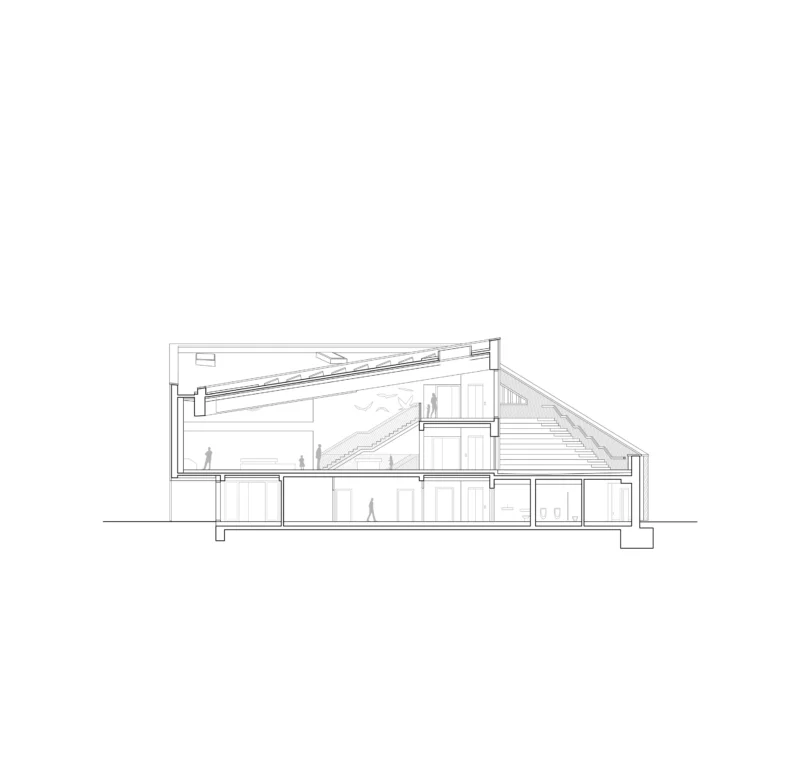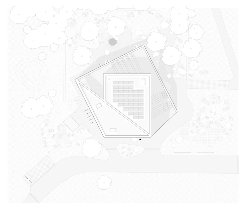 Zwei wesentliche Richtungen bestimmen die Form des Naturerlebniszentrums: Mit seiner Auffaltung und dem Terrassenaufgang orientiert es sich zu den Ufern des Stausees, gleichzeitig öffnet es sich in Richtung Straße und Ortseingang. Die hieraus entwickelte Dachform verleiht dem Gebäude eine identitätsstiftende Adresse mit Signalwirkung.