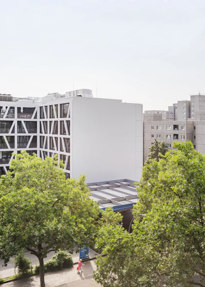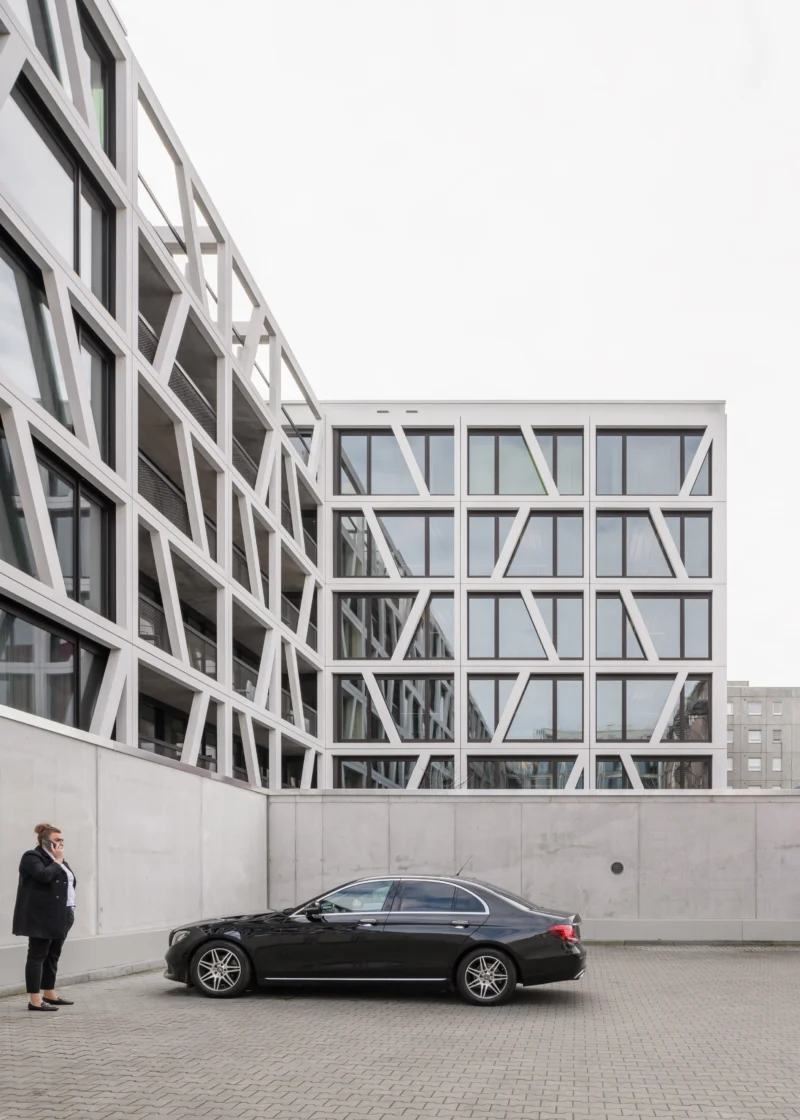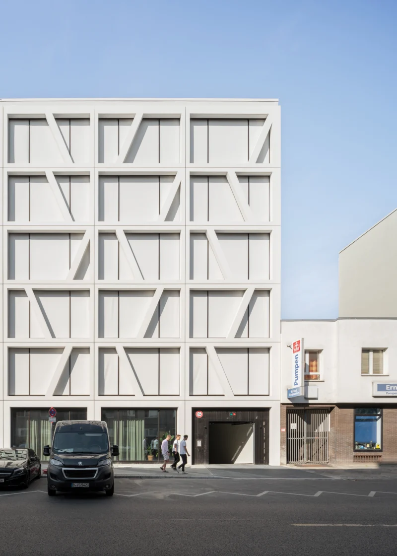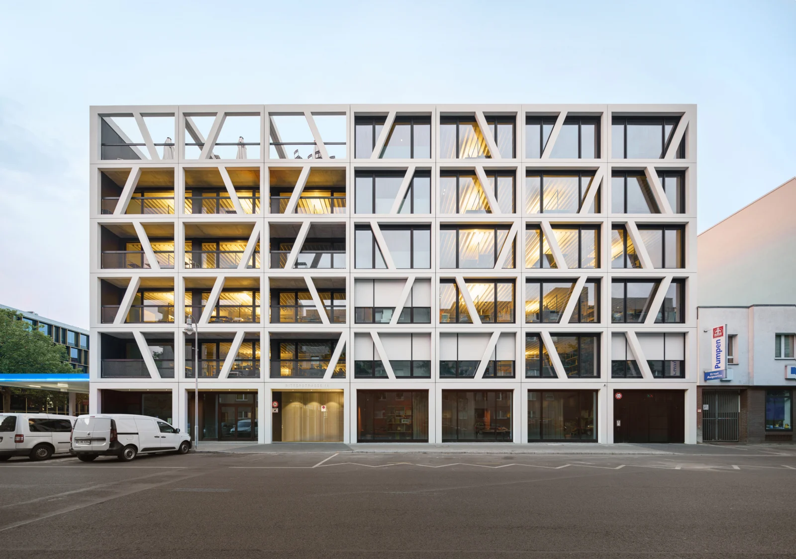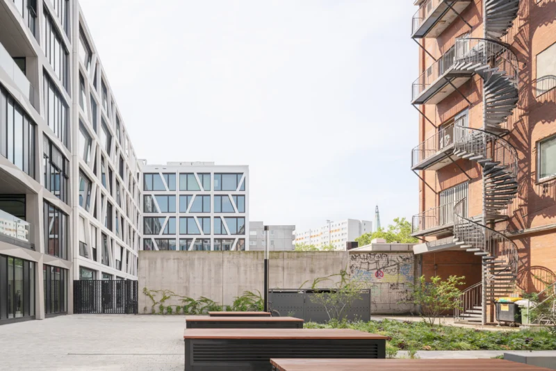 Das Bürogebäude Ritterstraße 16 positioniert sich als eine robuste Struktur im geschäftigen und rauen Stadtteil Berlin Kreuzberg. Eine sichtbare, sich über alle Geschosse verwebende Fassadenstruktur aus Betonfertigteilen verbindet die Vielfalt der Nutzer in seinem Inneren zu einem gemeinschaftlichen Bild. Der Baukörper wird straßenbegleitend als Blockrand ausgebildet und schafft im Rückbereich einen intimen Hof mit Freitreppe. Loggien und Terrassen strukturieren die Fassaden und schaffen Aufenthaltsflächen im Freien für alle Nutzer des Hauses.