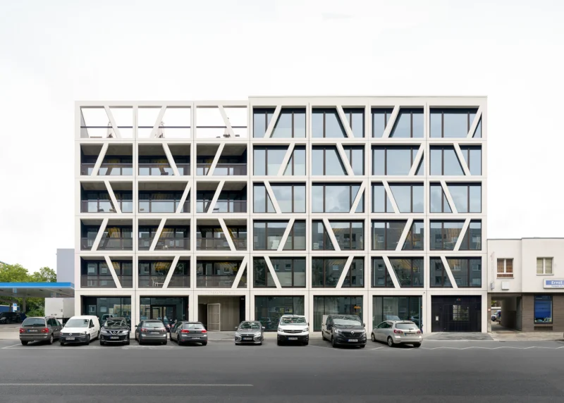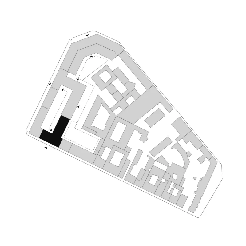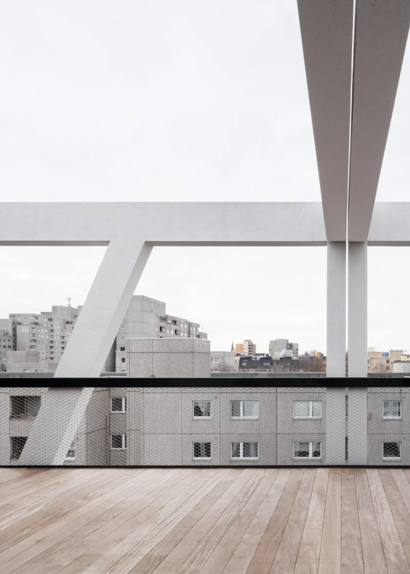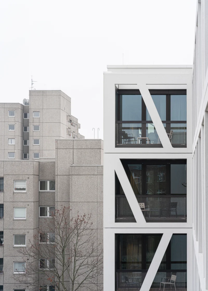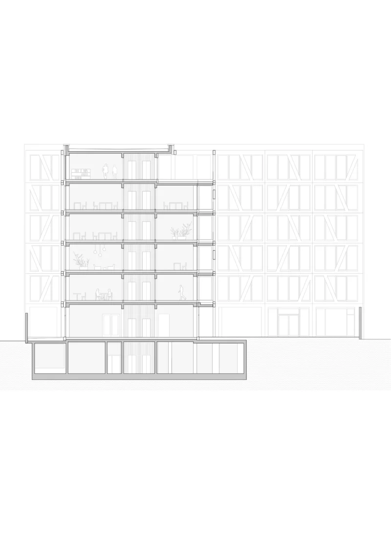 Das Bürogebäude Ritterstraße 16 positioniert sich als eine robuste Struktur im geschäftigen und rauen Stadtteil Berlin Kreuzberg. Eine sichtbare, sich über alle Geschosse verwebende Fassadenstruktur aus Betonfertigteilen verbindet die Vielfalt der Nutzer in seinem Inneren zu einem gemeinschaftlichen Bild. Der Baukörper wird straßenbegleitend als Blockrand ausgebildet und schafft im Rückbereich einen intimen Hof mit Freitreppe. Loggien und Terrassen strukturieren die Fassaden und schaffen Aufenthaltsflächen im Freien für alle Nutzer des Hauses.