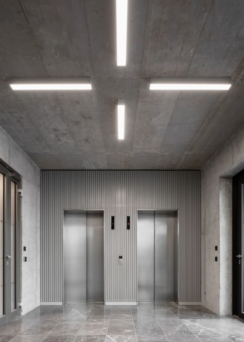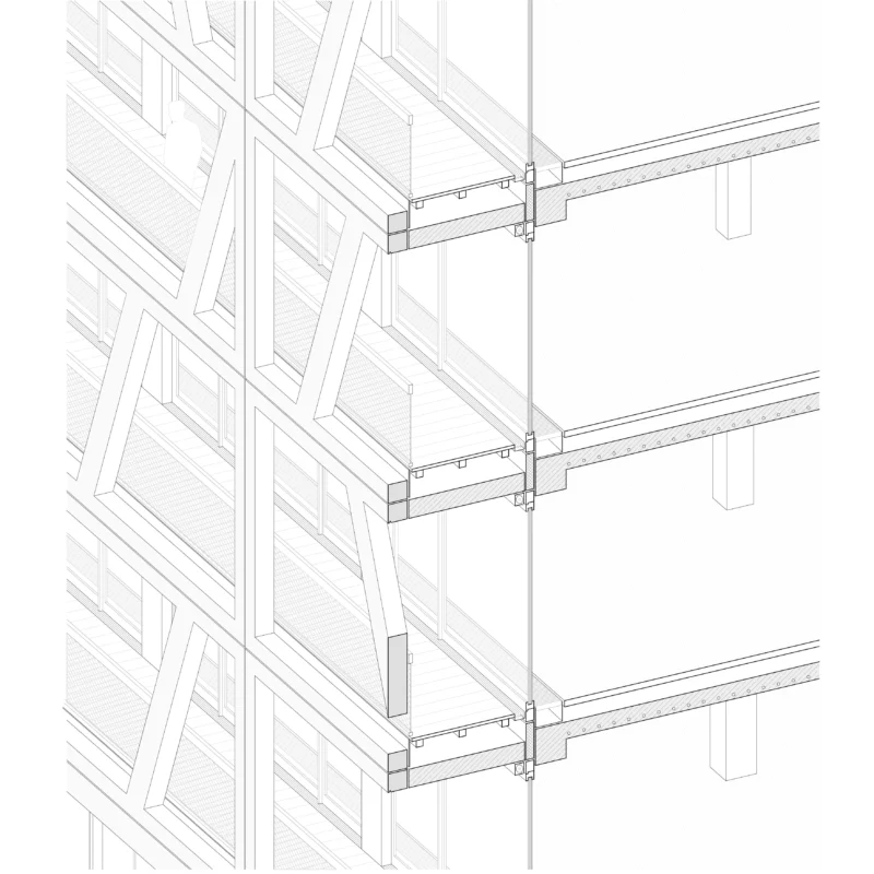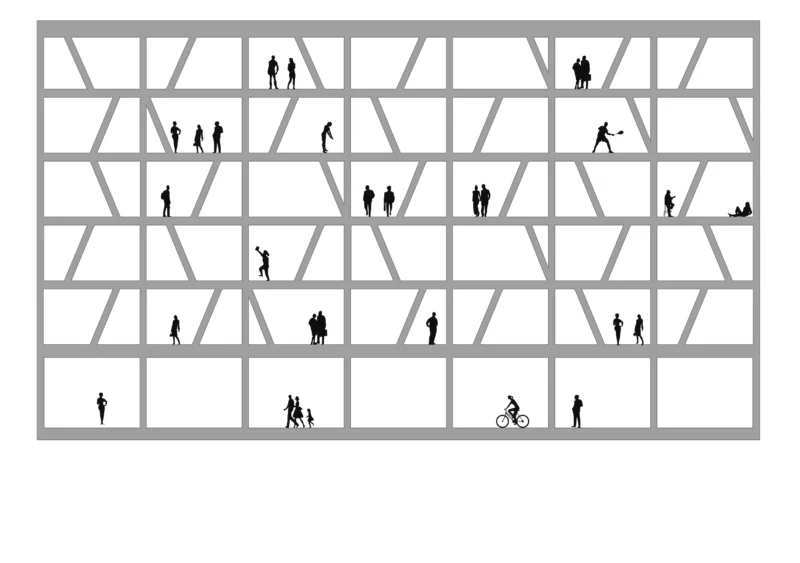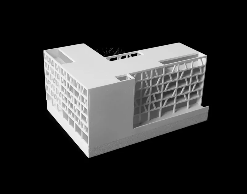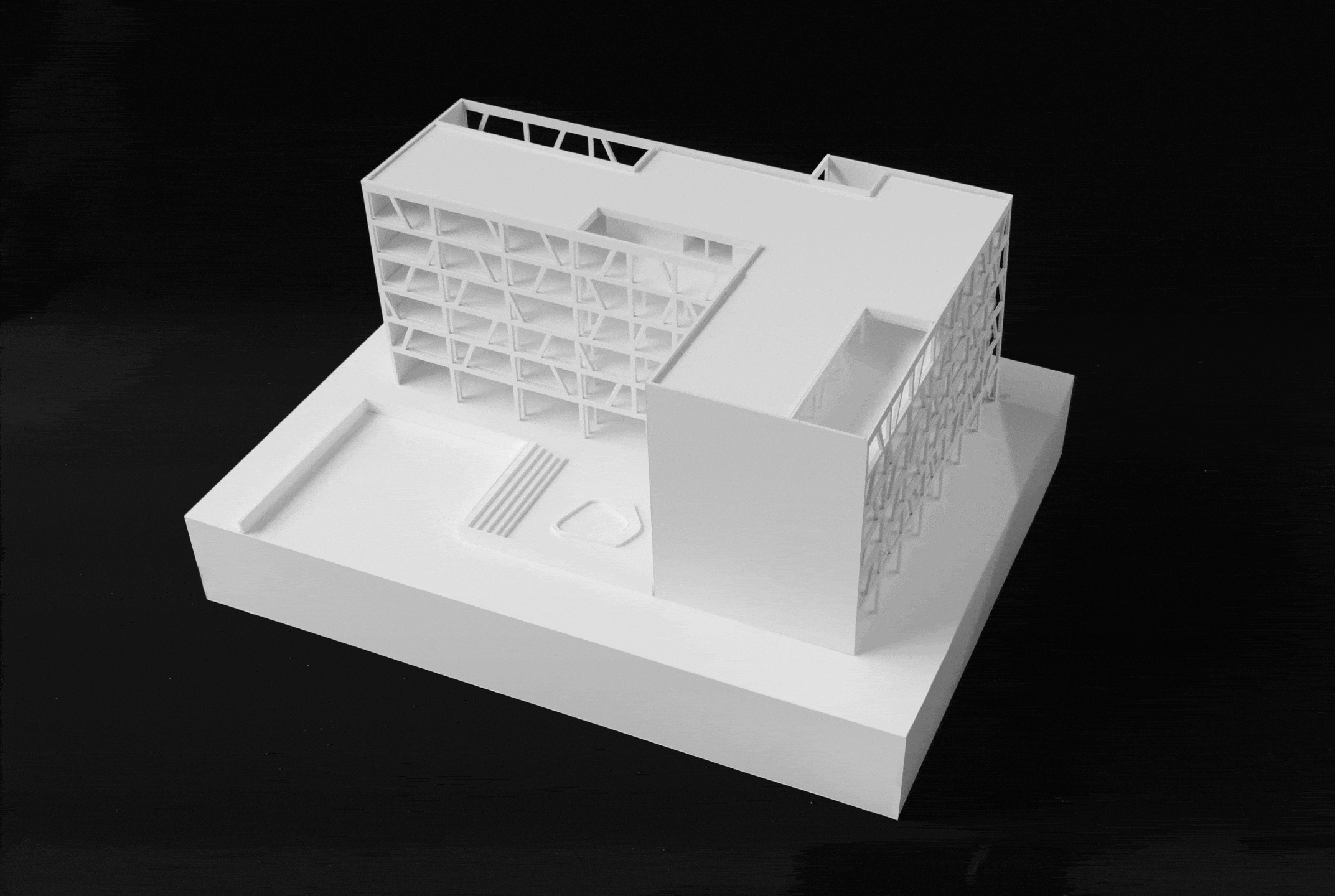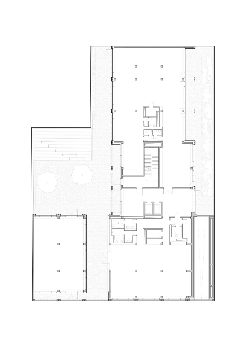 Das Bürogebäude Ritterstraße 16 positioniert sich als eine robuste Struktur im geschäftigen und rauen Stadtteil Berlin Kreuzberg. Eine sichtbare, sich über alle Geschosse verwebende Fassadenstruktur aus Betonfertigteilen verbindet die Vielfalt der Nutzer in seinem Inneren zu einem gemeinschaftlichen Bild. Der Baukörper wird straßenbegleitend als Blockrand ausgebildet und schafft im Rückbereich einen intimen Hof mit Freitreppe. Loggien und Terrassen strukturieren die Fassaden und schaffen Aufenthaltsflächen im Freien für alle Nutzer des Hauses.