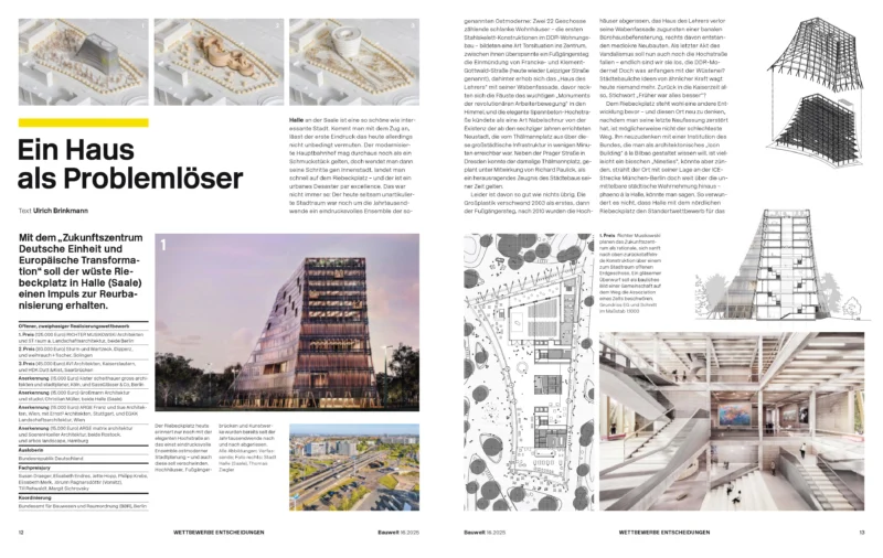 Ulrich Brinkmann schreibt in der Bauwelt 16.2025 über das Wettbewerbsergebnis für das Zukunftszentrum für Deutsche Einheit und Europäische Transformation.