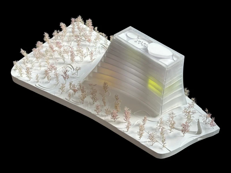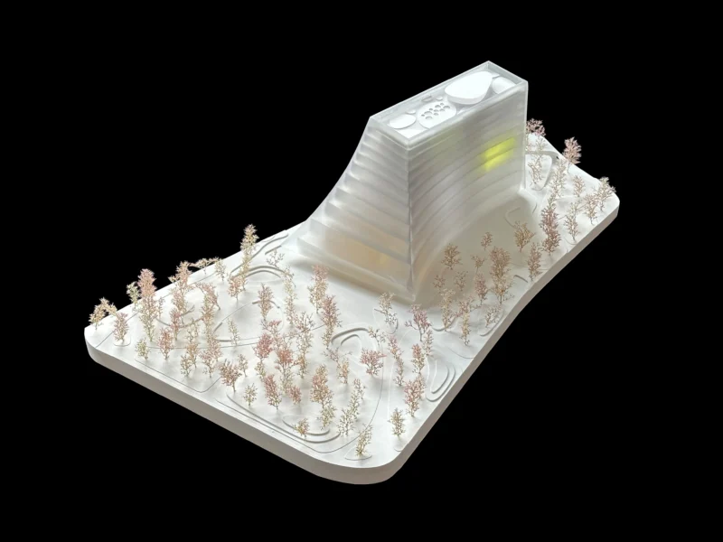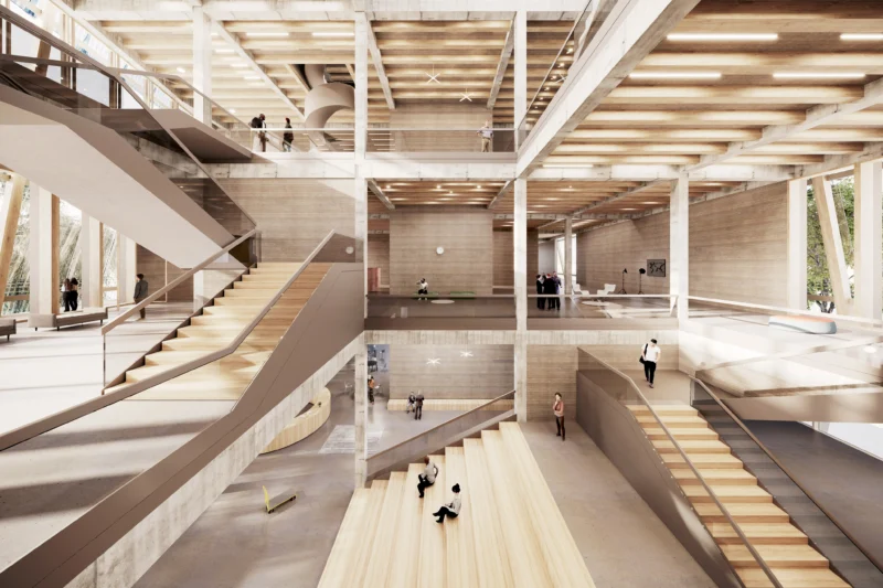 Trotz beeindruckender Größe öffnet sich das Zukunftszentrum mit der Leichtigkeit eines Pavillons zum umgebenden Grünraum. Umlaufende Vordächer bieten allseitig geschützte Freibereiche. Im Inneren verbindet ein offenes Treppenensemble als vertikaler Campus alle öffentlichen Etagen – die Funktionen sind programmatisch geschichtet, von Saal und Campus im Erdgeschoss über Ausstellungen und Lernlandschaft bis zum Panorama-Rundgang mit Rooftop-Bar auf dem Dach.