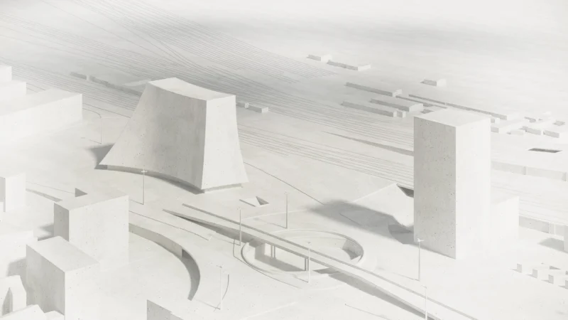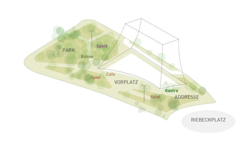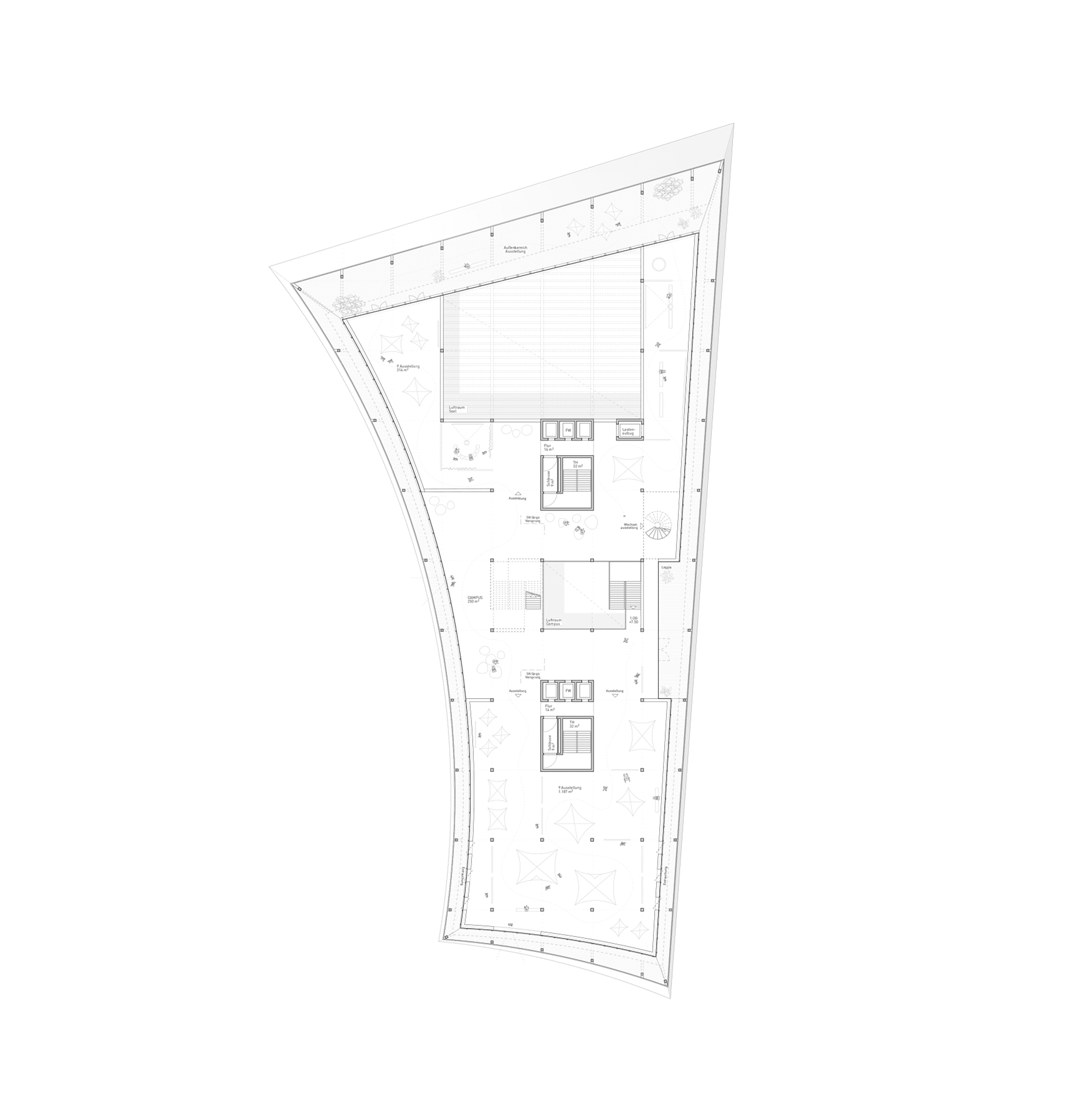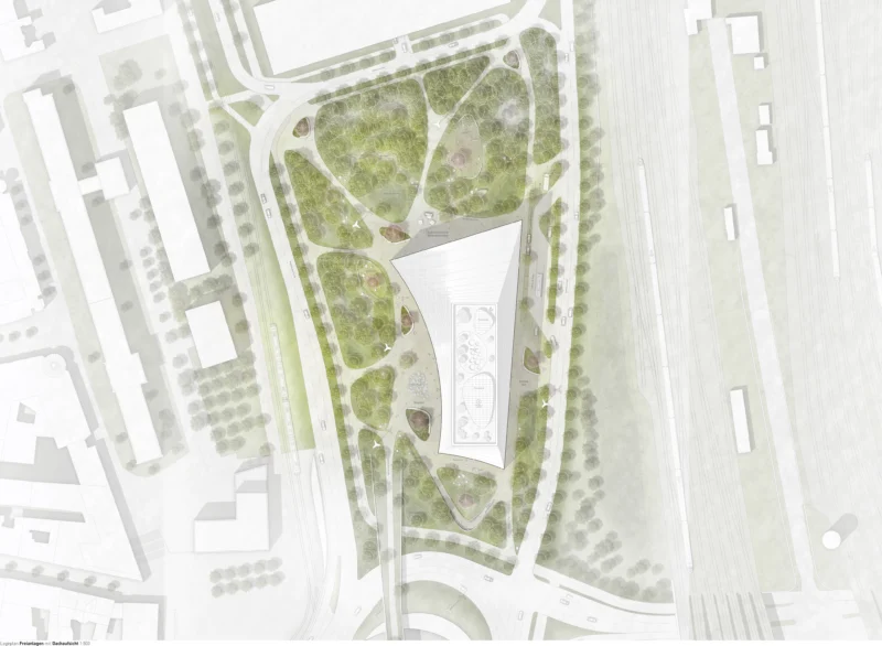 Mit der Geste eines großen Daches spannt das Zukunftszentrum am Riebeckplatz in Halle einen geschützten Ort auf, an dem sich Wissenschaft, Kultur und Begegnung unter einem Dach vereinen. Die geschwungene Gebäudekontur zeichnet sich weithin sichtbar in der Stadtsilhouette ab und begegnet dem heterogenen Ensemble des Riebeckplatzes mit schmal aufstrebender, die Mitte bestärkender Fassade. Nach Westen weitet sich der Baukörper in großem Bogen zum öffentlichen Freiraum mit begrünten Fuß- und Radwegen.