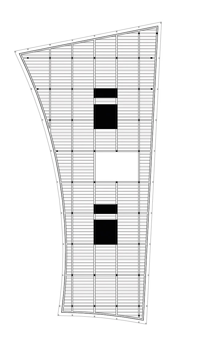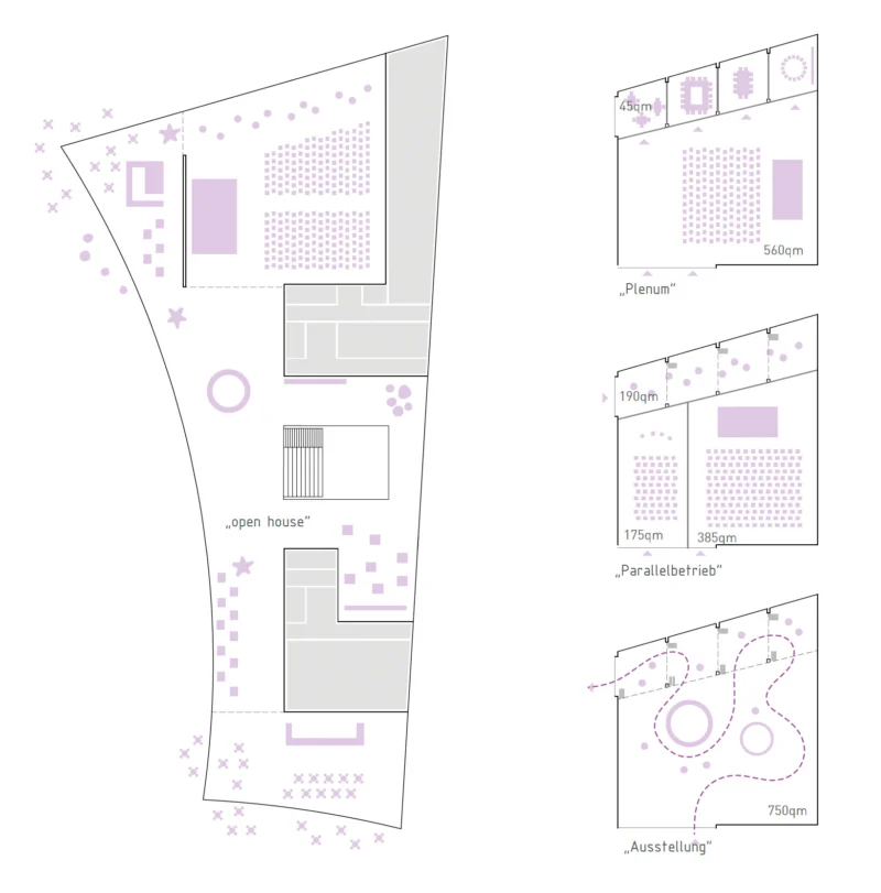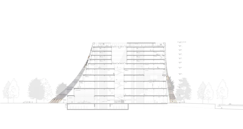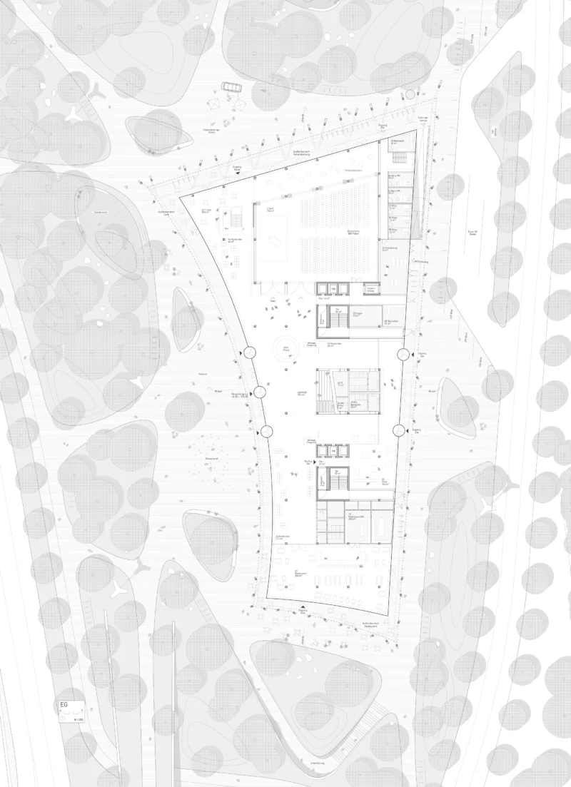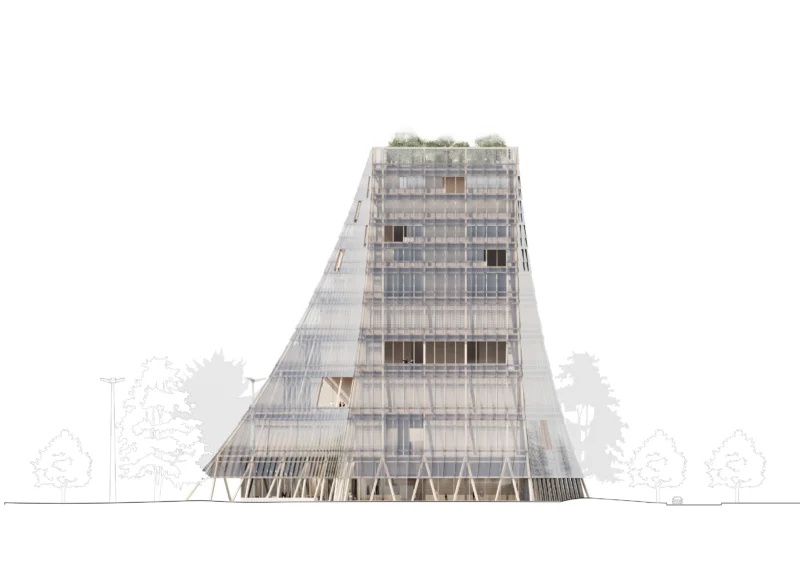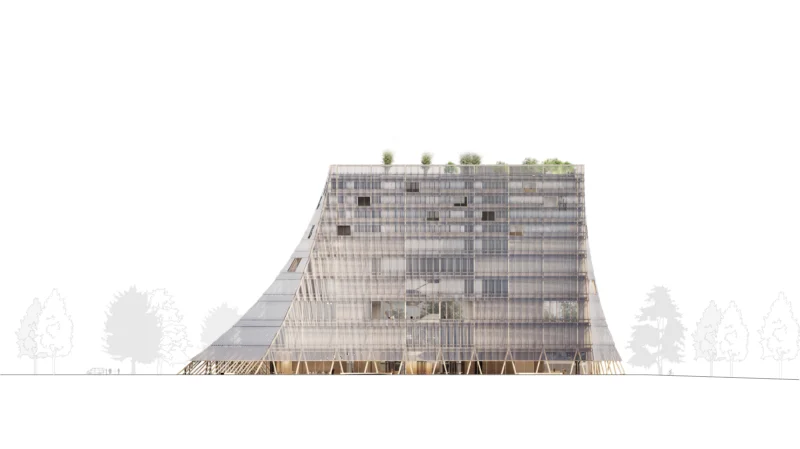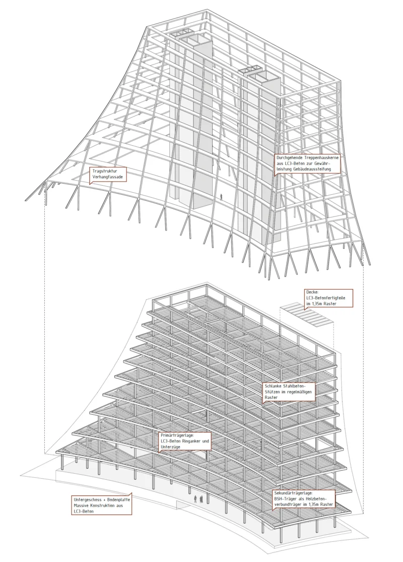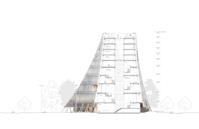Die Fassade gliedert sich in drei Ebenen: eine äußere Dachhaut aus Glaspaneelen mit Photovoltaik, eine bauklimatische Pufferzone mit geschützten Aufenthaltsflächen und eine Innenhülle aus Lehm, Schilf und Holz. Das elementbasierte Tragwerk mit Holz-Betonverbunddecken ist vom Ausbau getrennt und ermöglicht die Anpassung an variierende Nutzungen. Kuratierte recyclierte Objekte im umgebenden Stadt-Wald-Park werden zu Botschaftern des Zentrums.